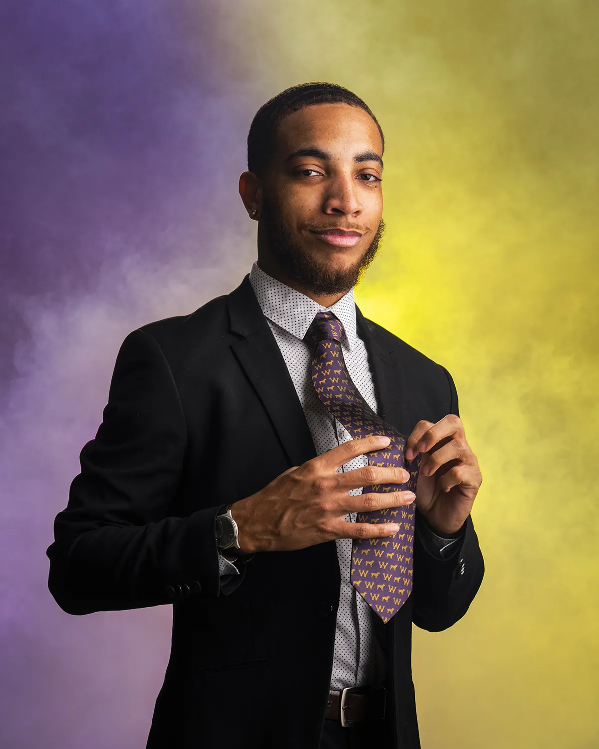 Undergraduate student Curtis Pointer's grad school choice reveal portrait.
