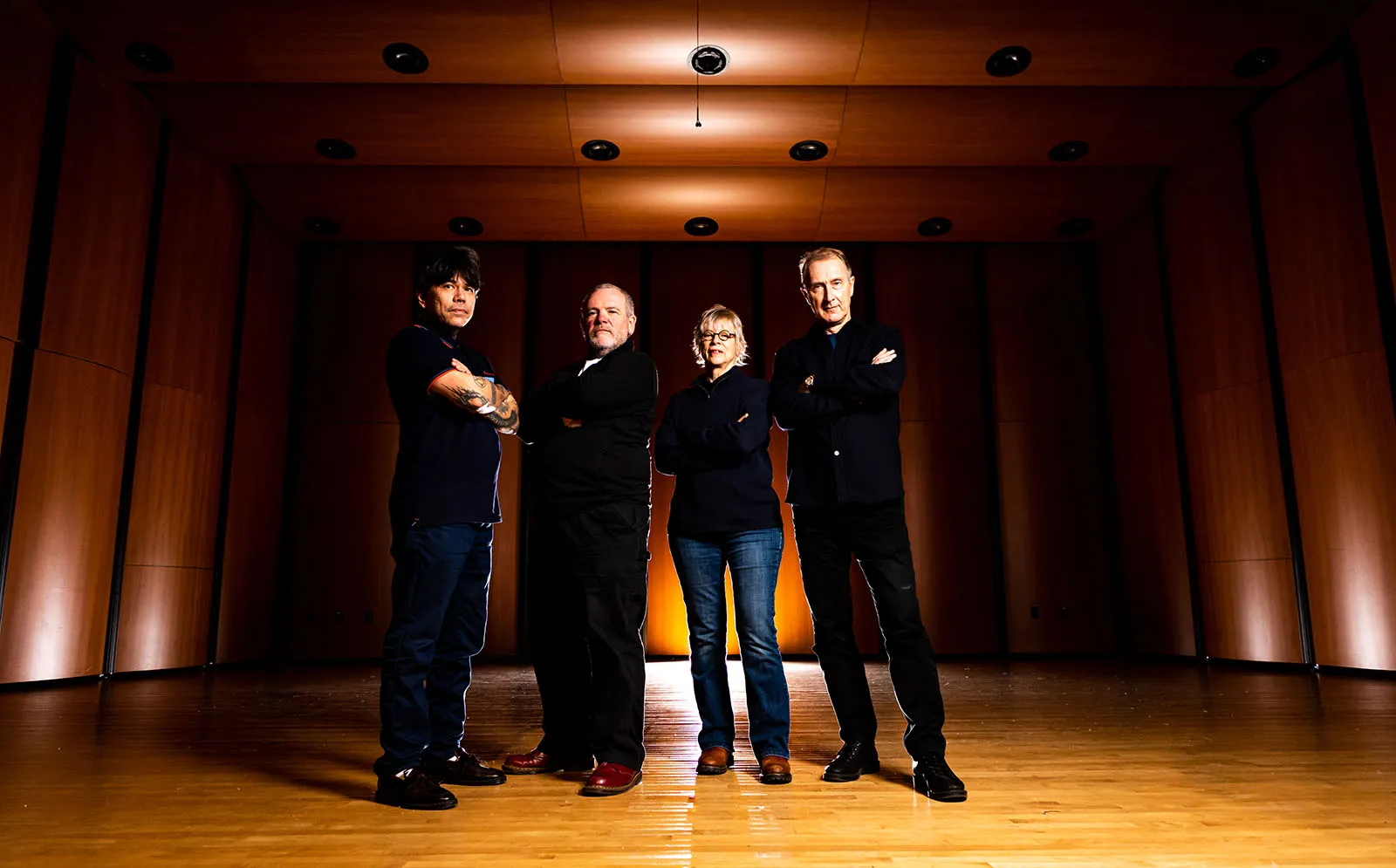 English post-punk band Gang of Four has been nominated for a Grammy Award in 2022. They have recently been rehearsing for their "Gang of Four 77-83 2022 North American Tour" at Endicott College where their longtime drummer, Hugo Burnham, serves as the internship coordinator for School of Visual and Performing Arts. From left, David Pajo, Hugo Burnham, Sara Lee, and Jon King.