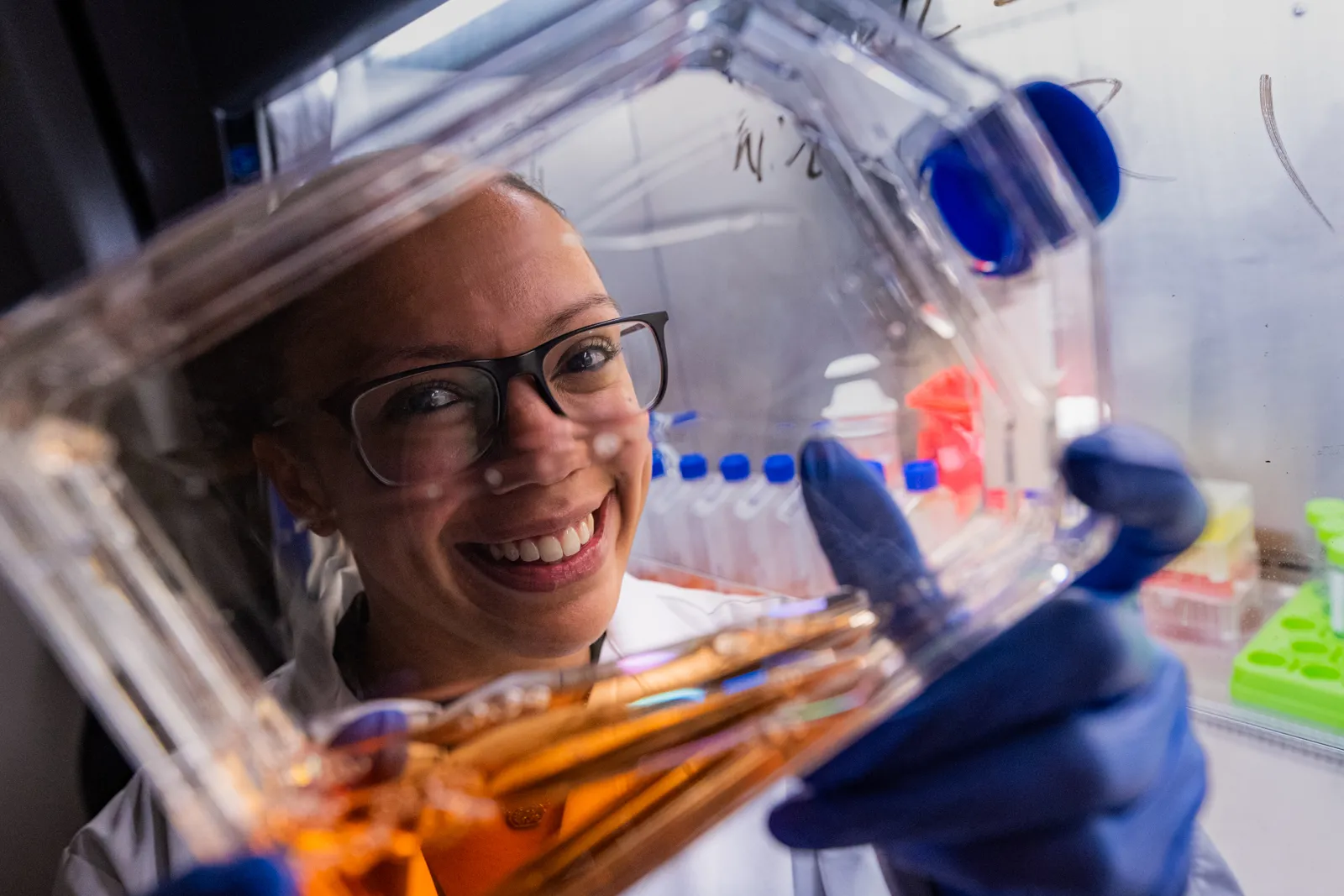 Aneliese Hebenstreit, an aerospace engineering student, is seen through the unique hypersonic wind tunnel with a mounted object for research. Light is projected through the port using special mirrors and prisms to get data and for observation.