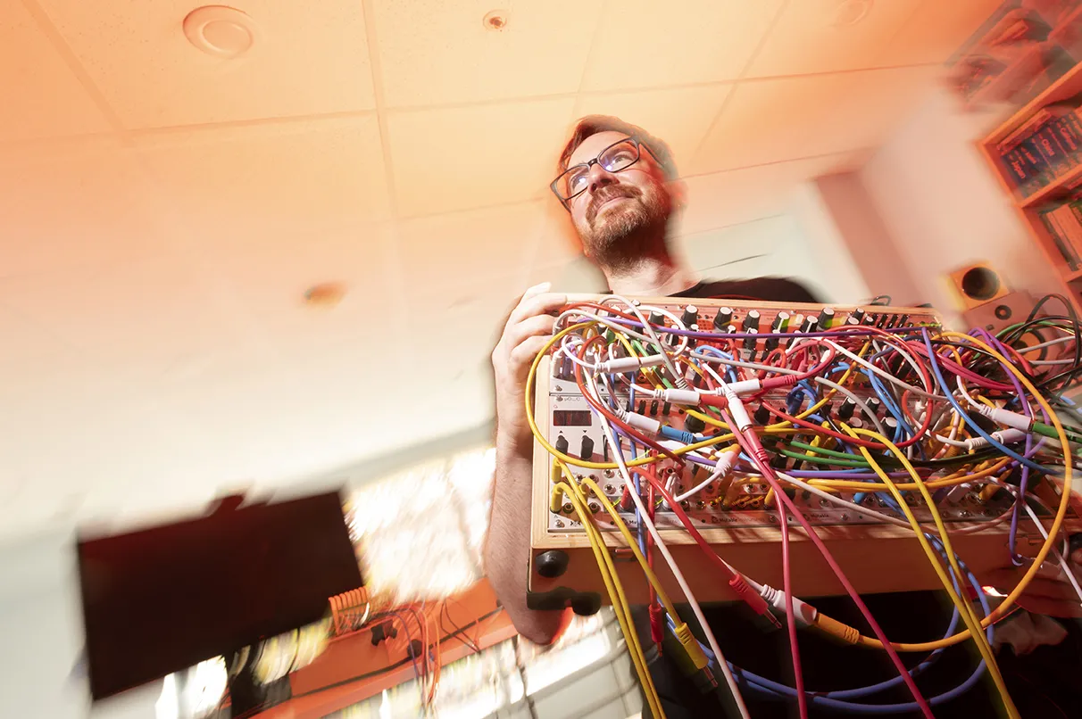 Patrick Lemieux, associate professor in Digital Media, works with his west coast version of a sythesizer in his home. He is an electronic musician with synthesizers and has a YouTube channel for his music.