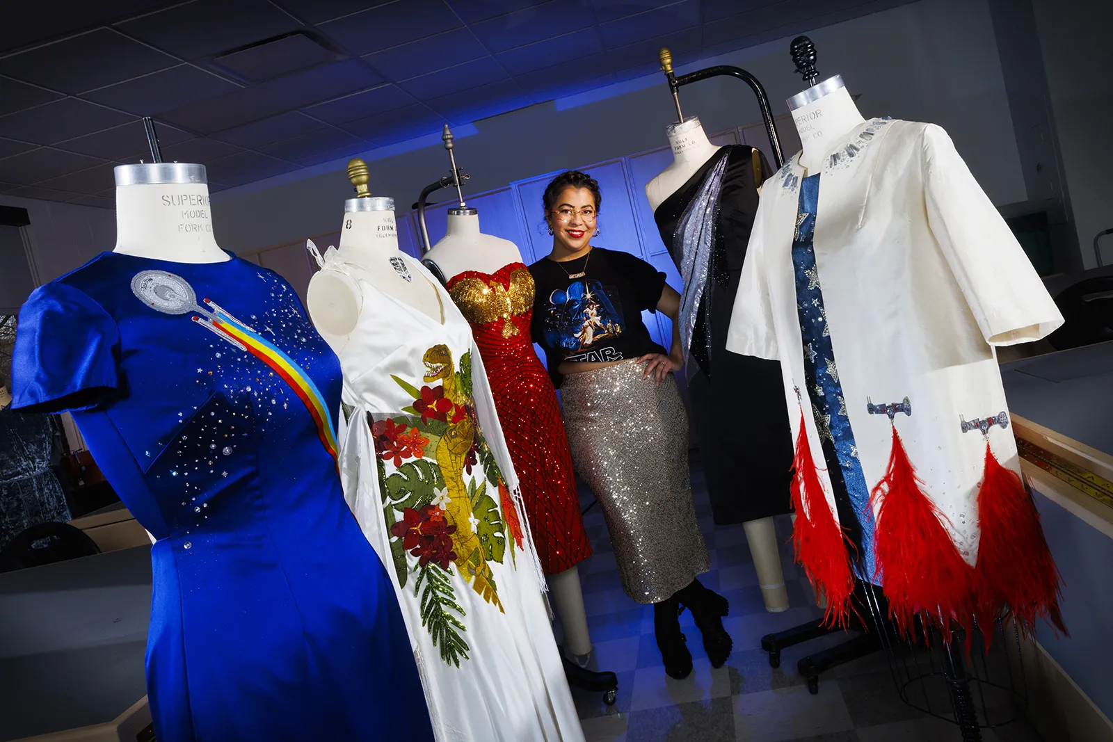 Fandom and fashion are colliding in the designs of Adria Sanchez-Chaidez. A University of Nebraska–Lincoln graduate student in textiles, merchandising and fashion design, Sanchez-Chaidez is passionate about paying homage to her favorite movie, TV and comic book characters in her clothing designs. Her designs, from left, pay homage to Star Trek, Jurassic Park, Wonder Woman and the Star Wars saga.