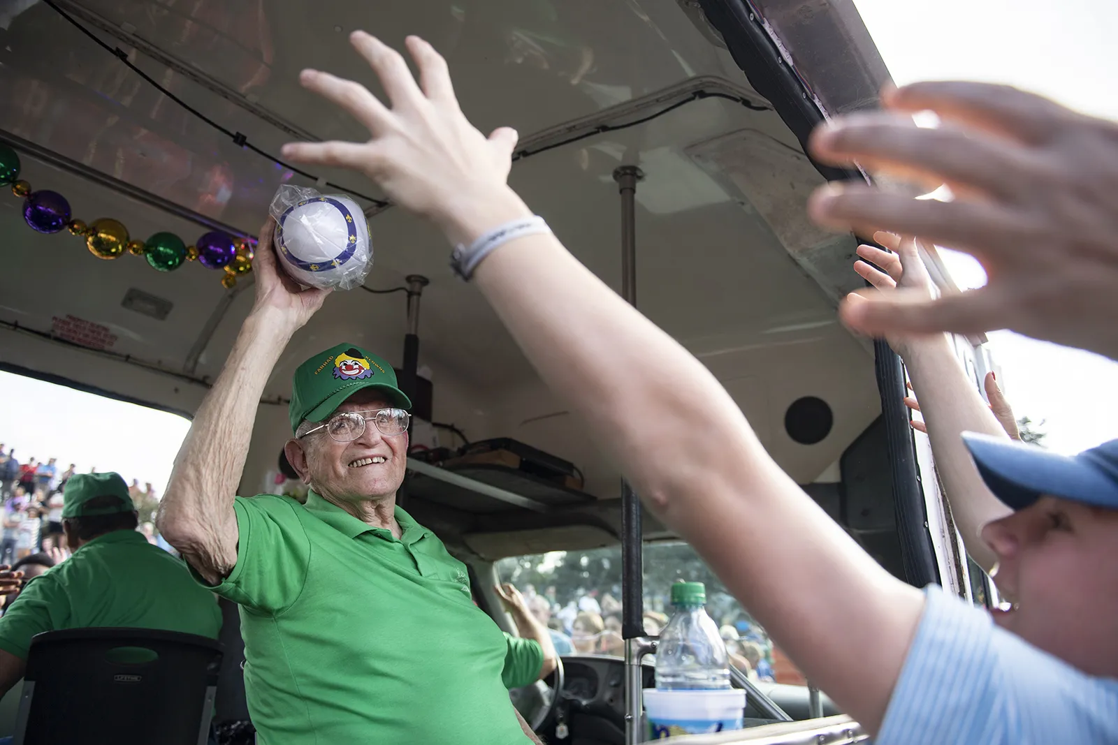 A participant in the Allstate Sugar Bowl New Year's Eve Parade prepares to throw a football to be caught by the crowd.