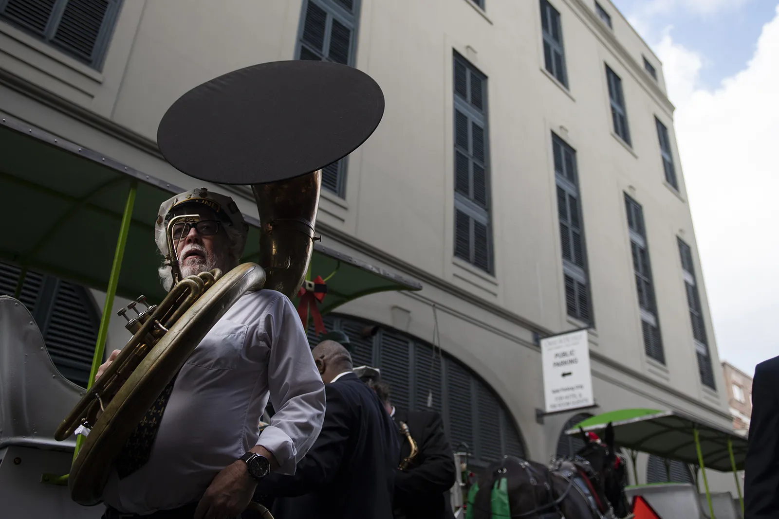 A member of the second line parade for the Allstate Sugar Bowl Parade looks down the street to view the audience.