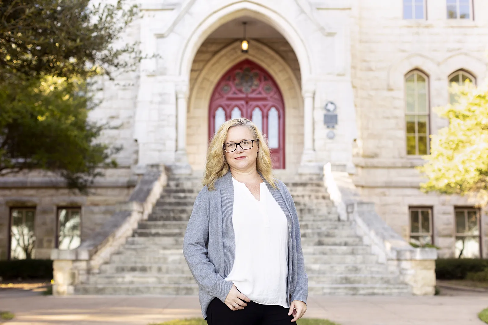 Kelly Green, associate professor of Psychology and Licensed Psychologist, stands in front of Main Building in Austin, Texas, on Monday, Oct. 18, 2021. Green wrote a self-help workbook, titled Relationships in Recovery: Repairing Damage and Building Healthy Connections While Overcoming Addiction. The workbook is a tool for people in recovery, their families and counseling professionals.