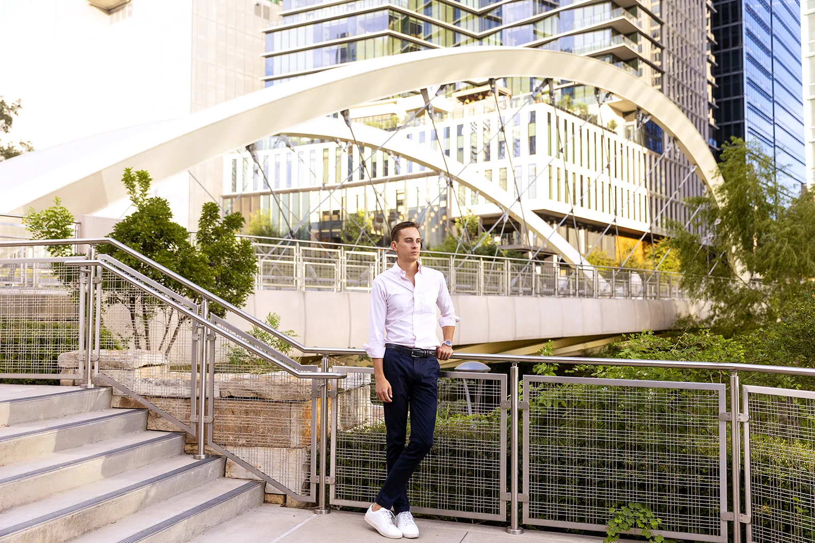 Christoph Hoermann stands near the Butterfly Bridge in downtown Austin, Texas, on Tuesday, Oct. 19, 2021. Hoermann '21, a Finance major, spent the summer completing an intensive internship with J.P. Morgan Chase & Co. This experience has led to an early post-grad job offer, as he will be joining their team as a private bank analyst in Palm Beach once he graduates in the fall.