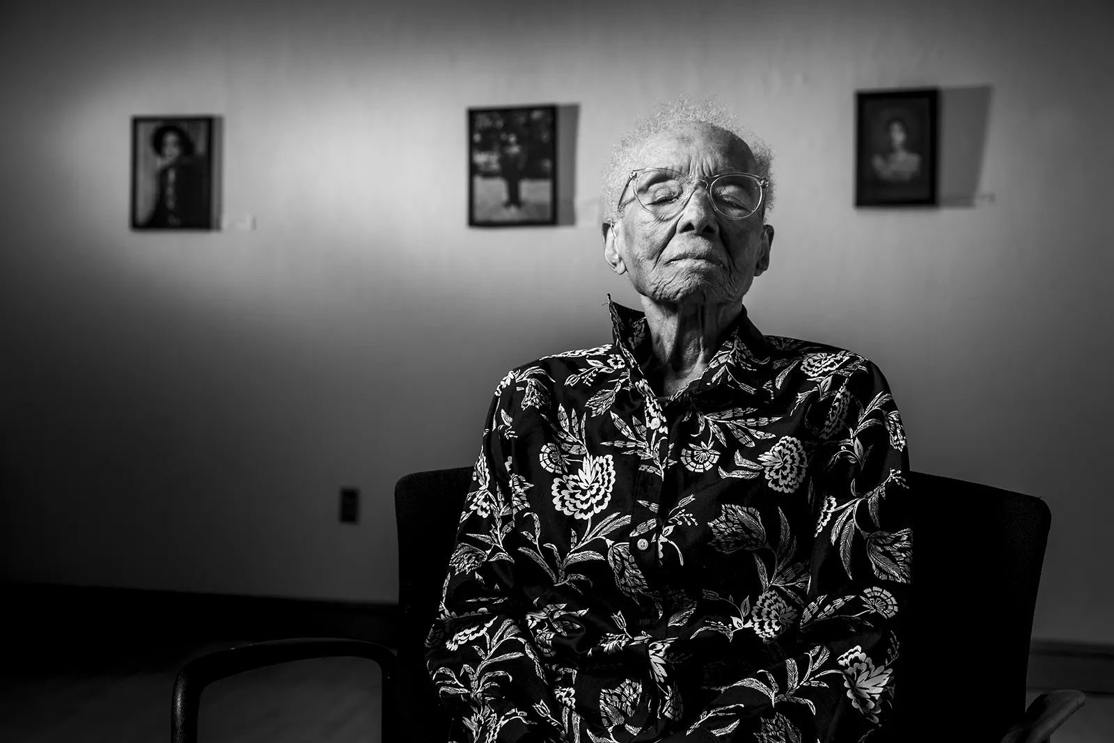 Edith Renfrow Smith ’37, the first black woman to graduate from Grinnell College and the oldest living alum of the college at 107 years-old poses for a portrait in the newly rededicated Smith Gallery, with an exhibition of photos of her life curated by a current student.