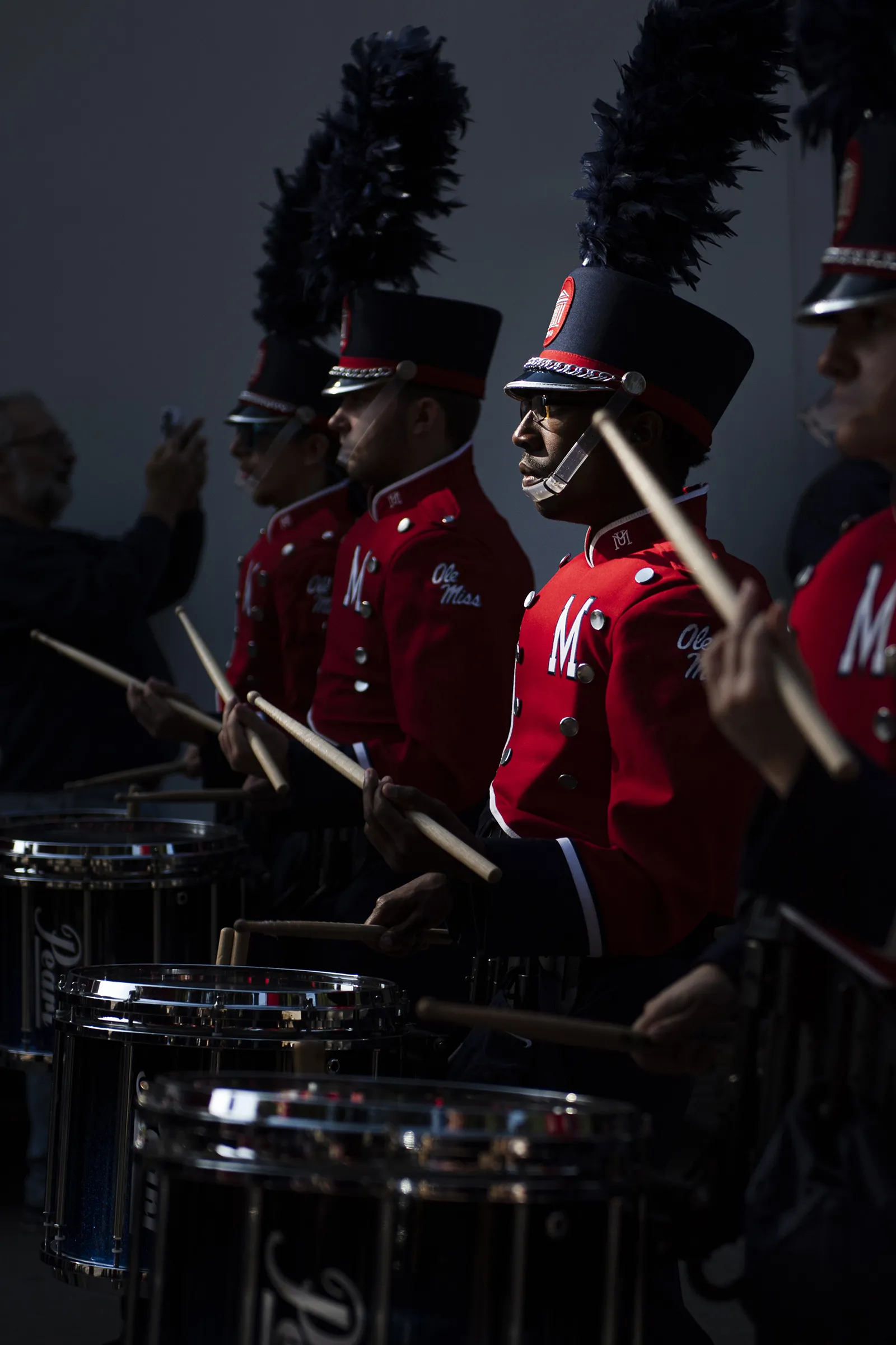 Senior Brandon Ashmore of the UM Marching Band's Drumline, performs on campus prior to the football game as the morning sun highlights his technique.