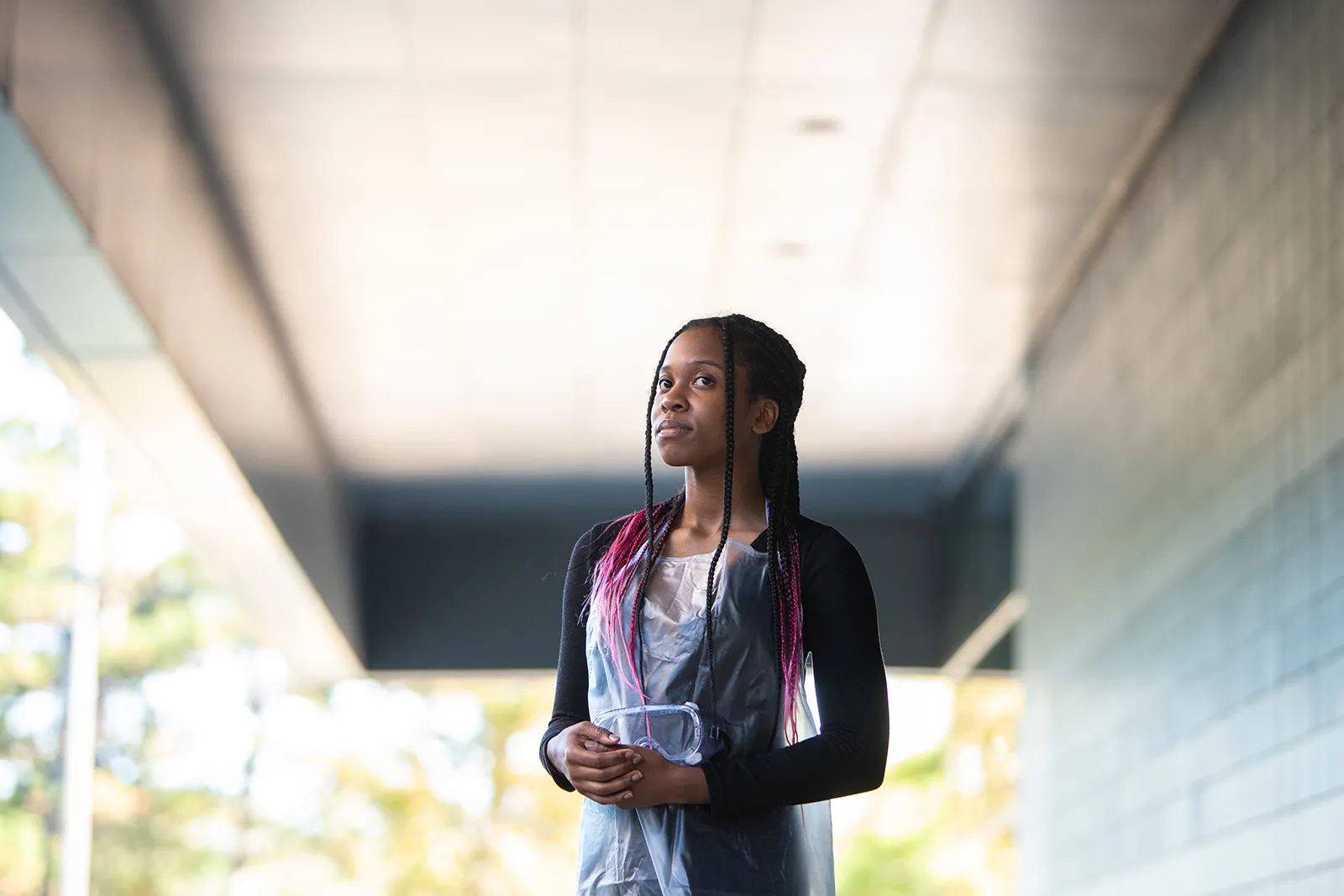 A portrait of UB student Jelyse Williams, one of 12 recipients of this year's New York Times College Scholarship, photographed in September 2021 outside Davis Hall. Williams intends to study biomedical engineering and has a number of hobbies, including art and music.