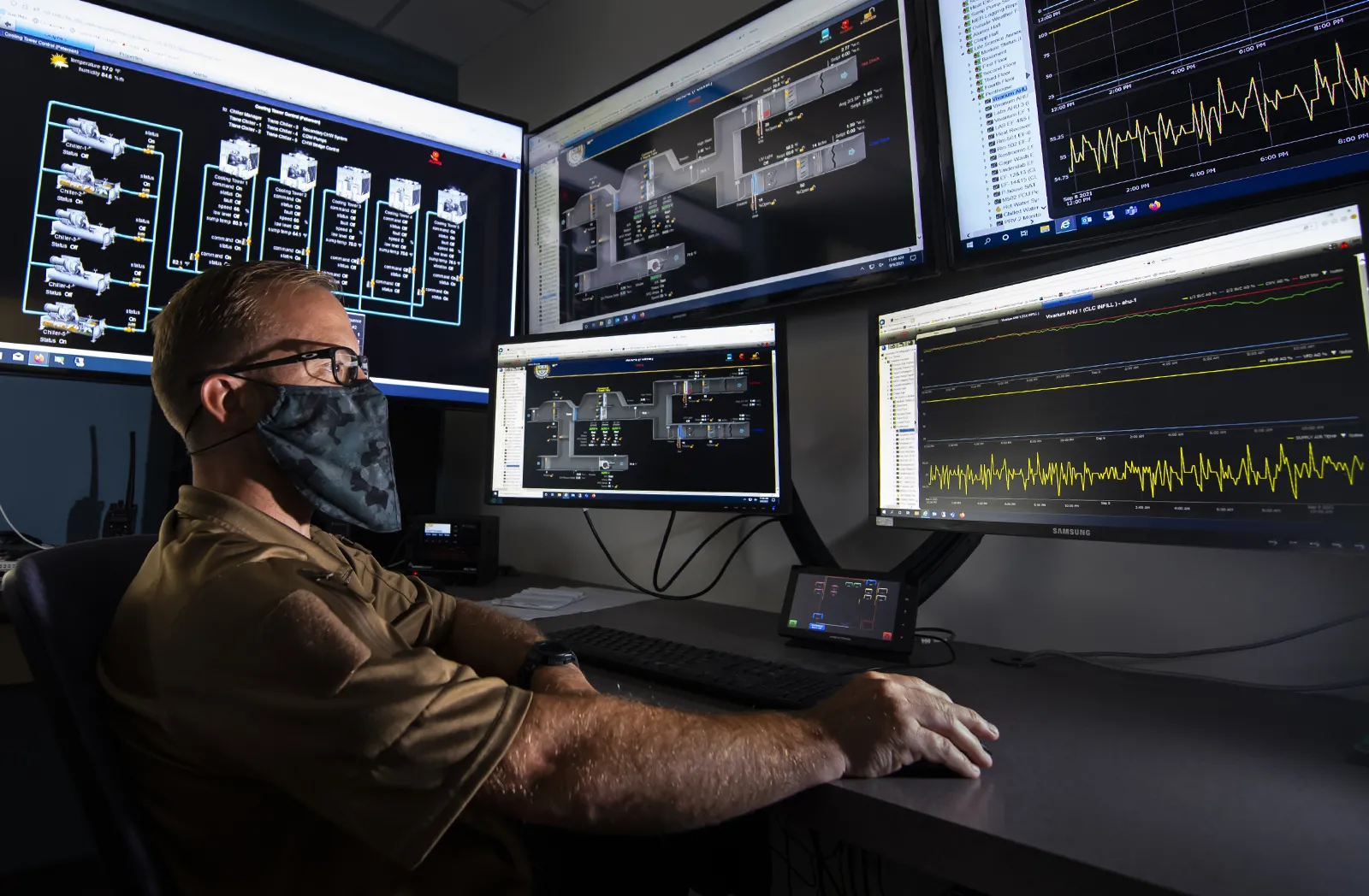 Facilities Management employee Jason Babeji has his finger on the pulse of the HVAC units for the entire campus in one control room that continuously monitors a million data points for air flow, pressure and temperature control.
