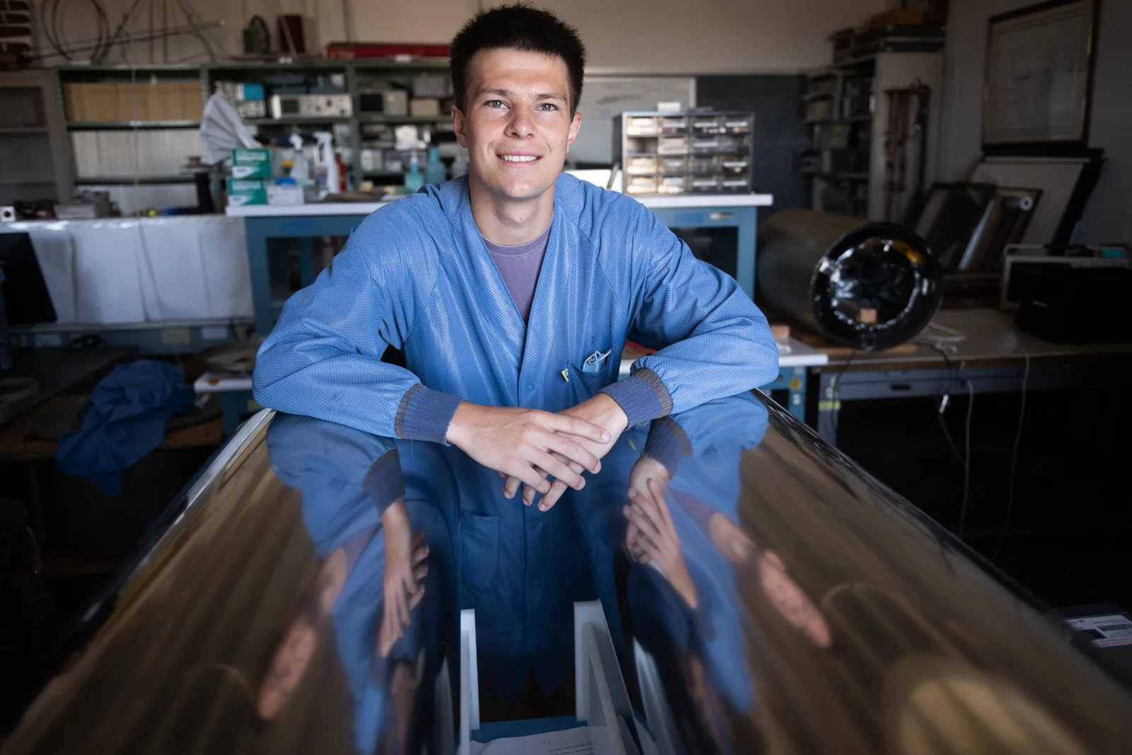 Andrew Carton poses for a portrait in his lab where he is working on an instrument that will launch into space on an upcoming NASA mission.