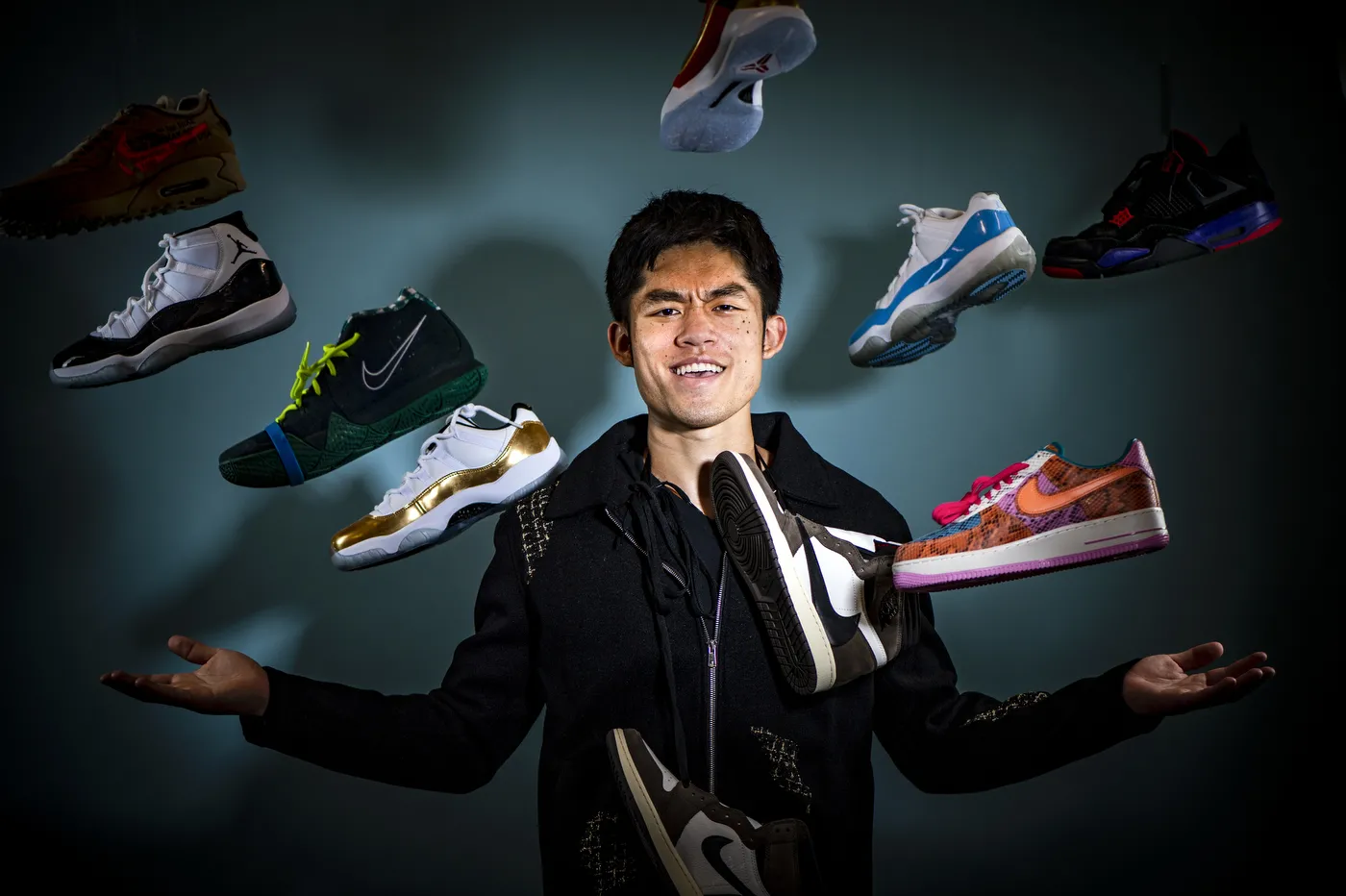 Sneaker Club founder Yuhong Su, who goes by Henry, poses with some of his sneaker collection.