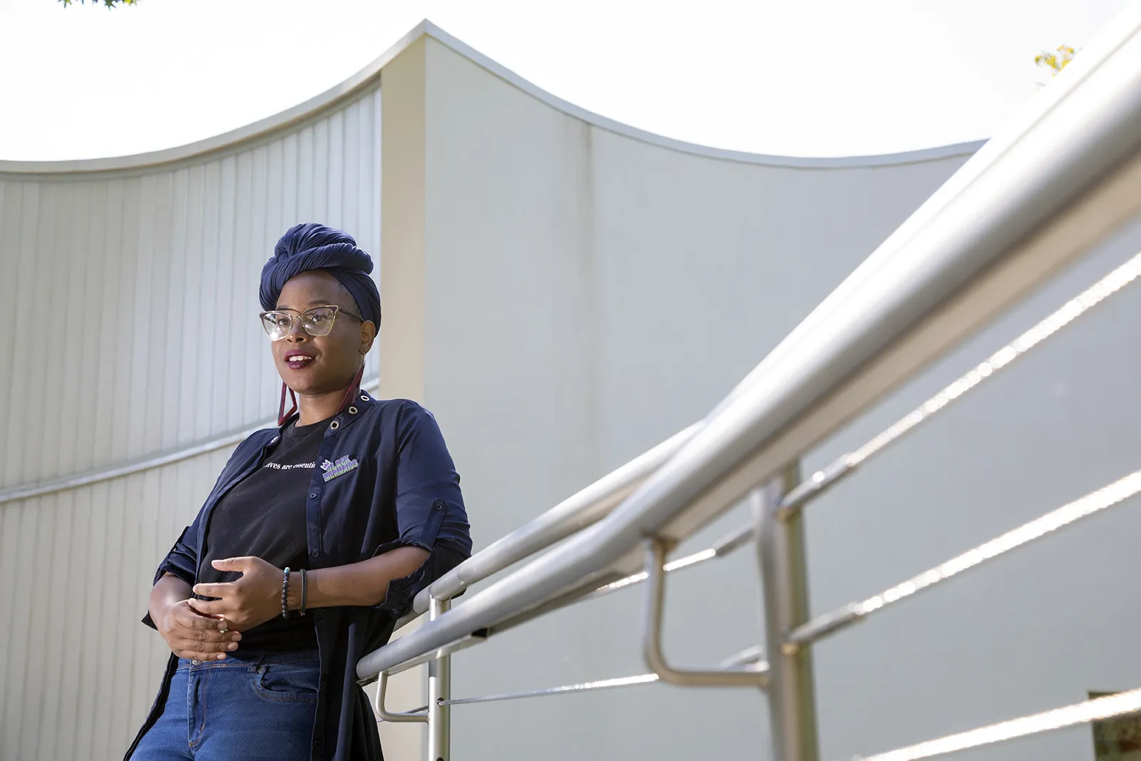 Artist in Residence, Shelby Elaine, poses in front of the new art building where she will be doing most of her work.
