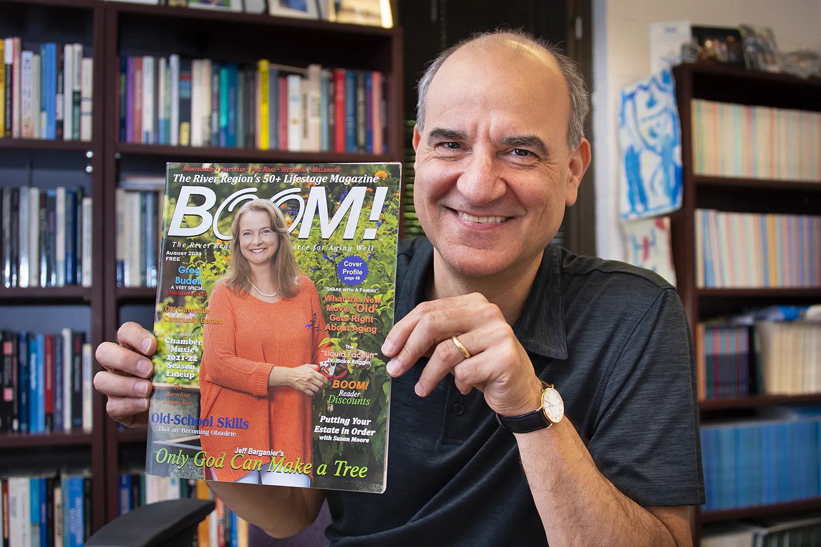 Professor of Political Science Andrew Cortell proudly displays a copy of BOOM! magazine which features a multi page article on his wife and how she has helped the city through property renovations.