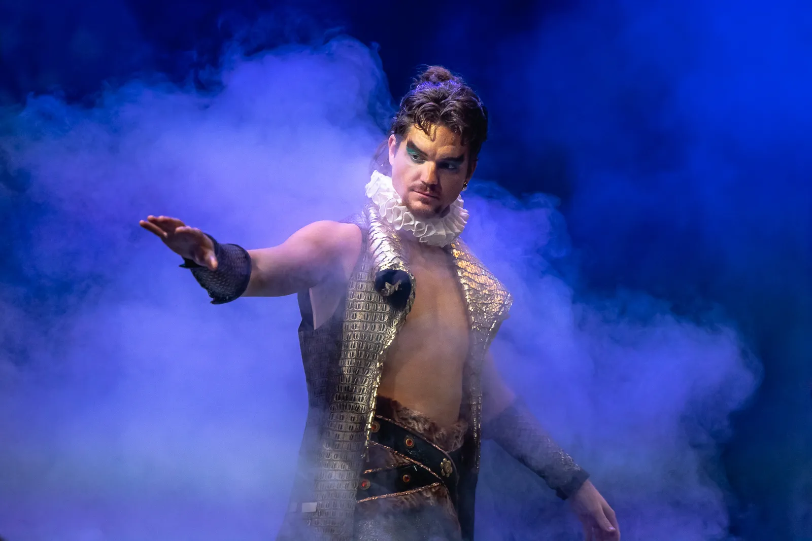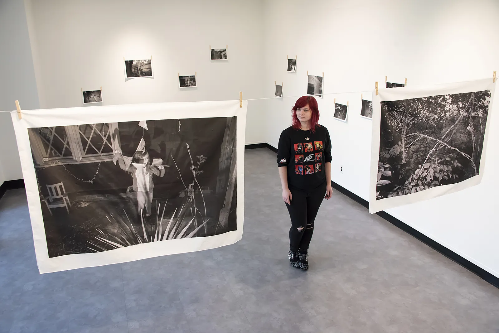 Ashley Burnette stoically poses with Hide Me in the Honeysuckle Patch artwork in the university's art gallery by Aaron Hardin. Burnette, who is an aspiring artist, was incredibly impressed with a new take of an historic style of photography.