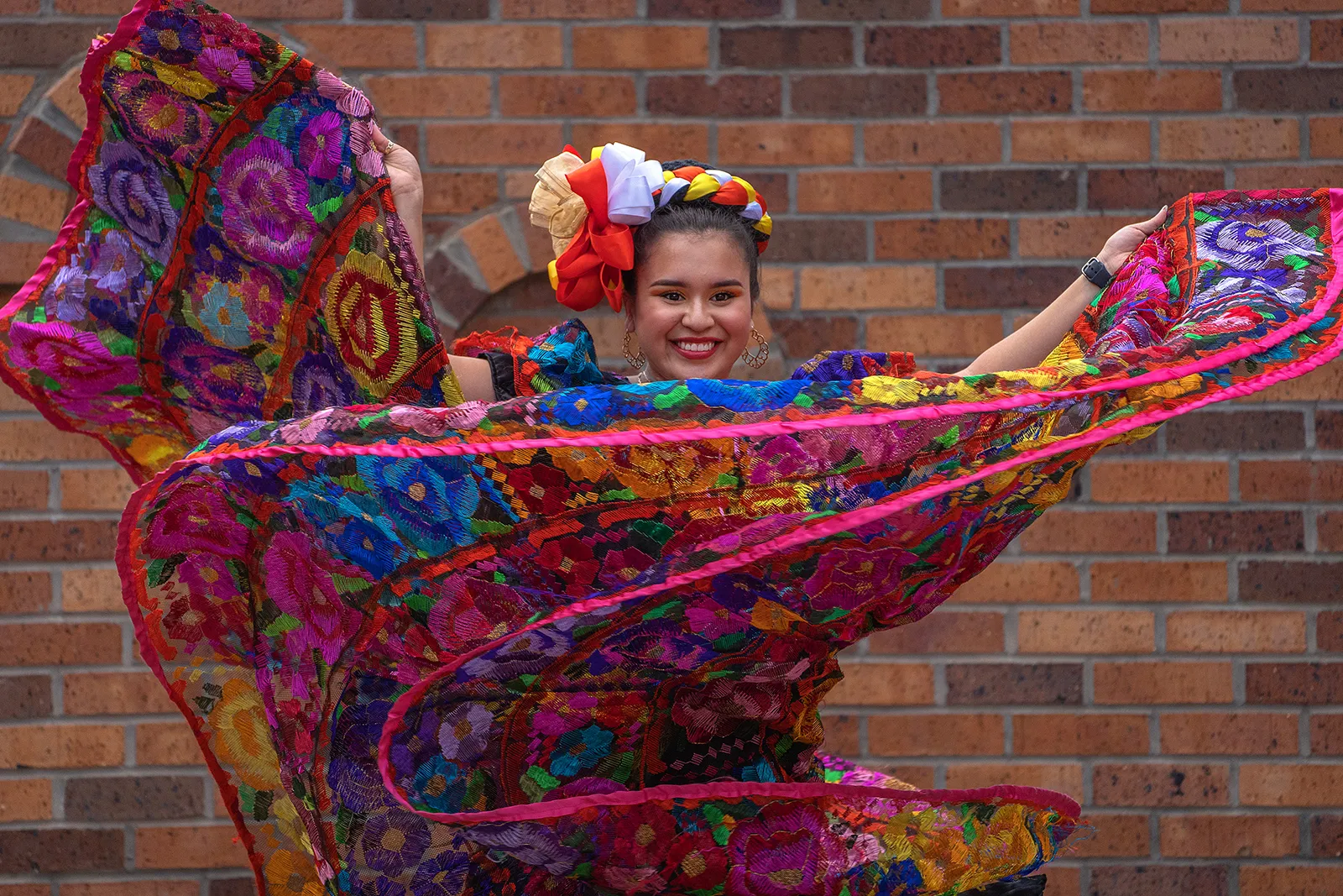 A student dances prior to the Hispanic Heritage Month celebration to signify the beginning of the festivities. She dances the traditional Baile Folklorico which creates swirls of colors by spinning the dress around.
