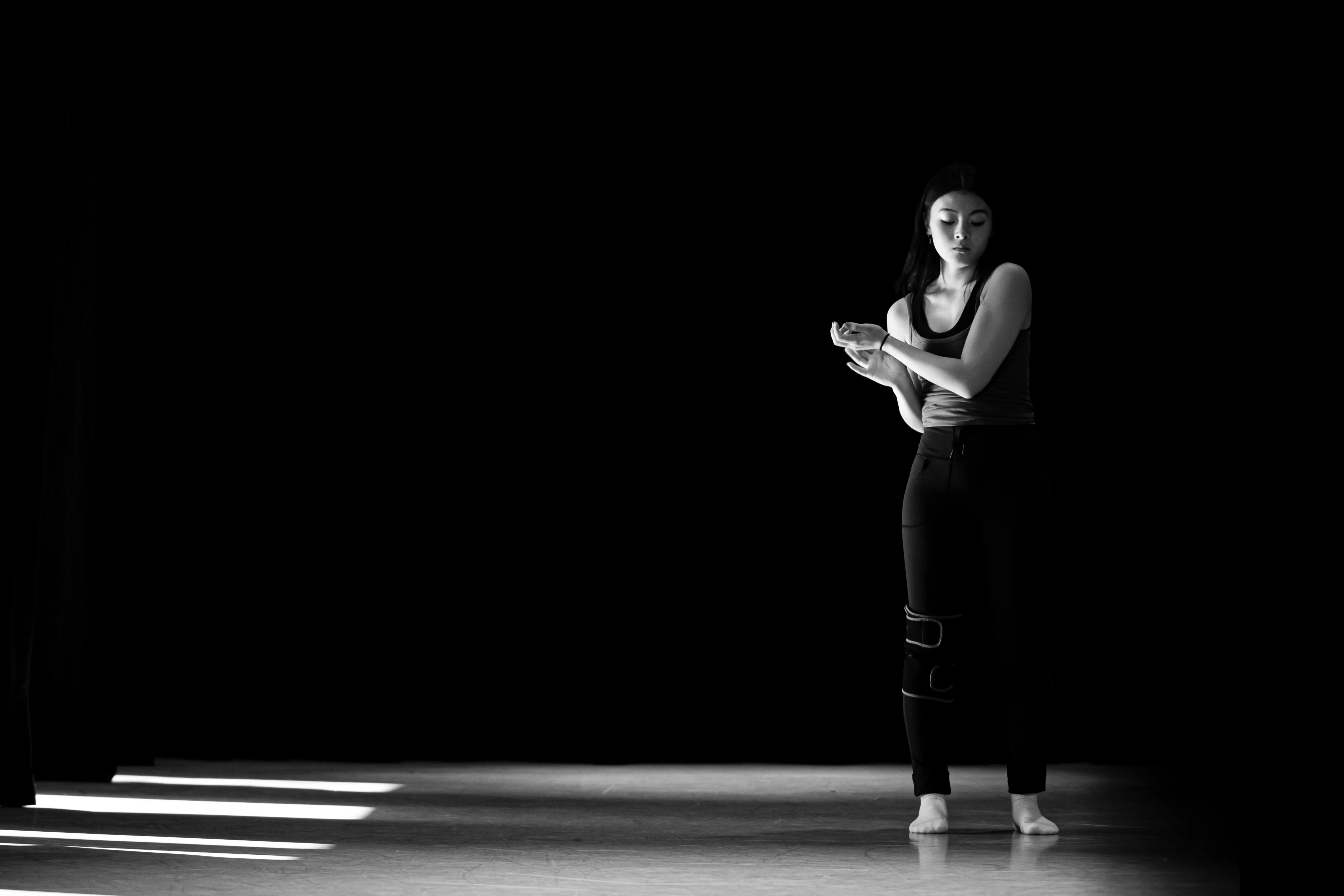 A student stretches in preparation of her dance rehearsal in the Performing Arts Center at Grand Valley State University.