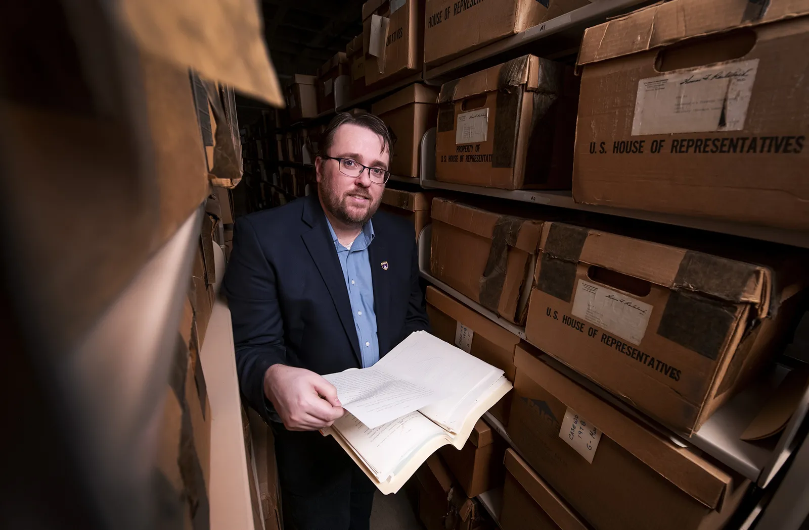 Libraries Professor Jeff Hancks reviews some of the papers contained in the 587 boxes of the Tom Railsback Collection that were donated to WIU Library Archives.