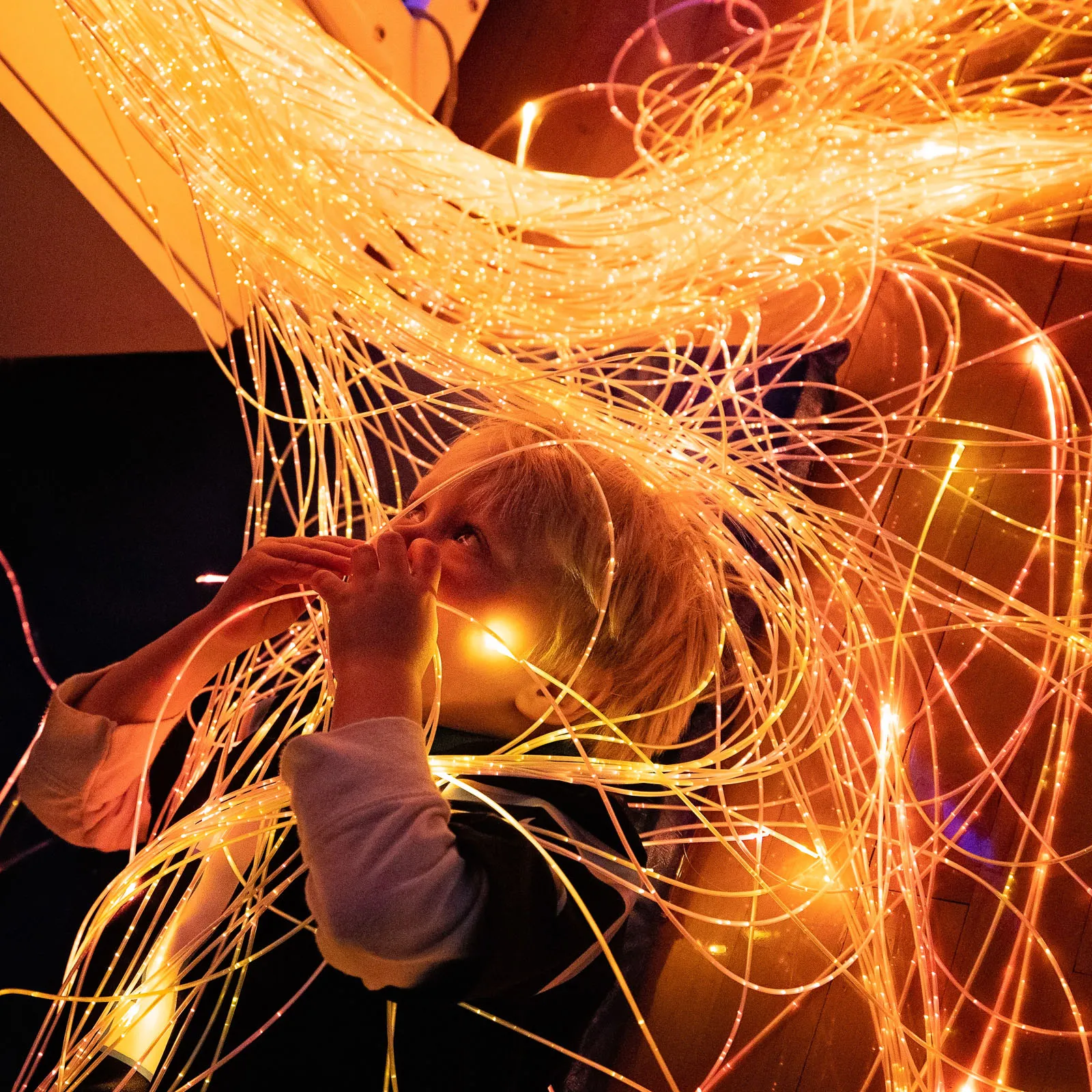 Lincoln Robinson, age 4, is wrapped in lights inside the PeeDee Sensory Room in Minges Coliseum. He was there during the ECU basketball game against Cincinnati.