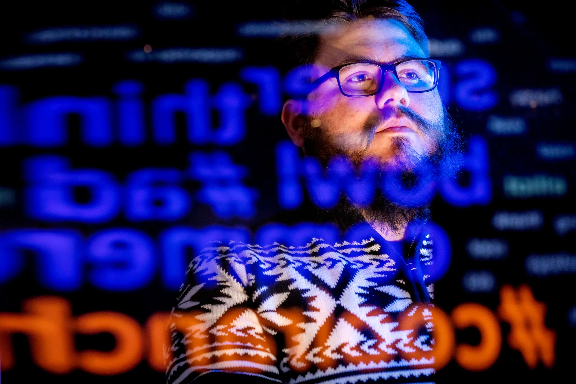 Portrait of a student researching Super Bowl ads on social media in real time.