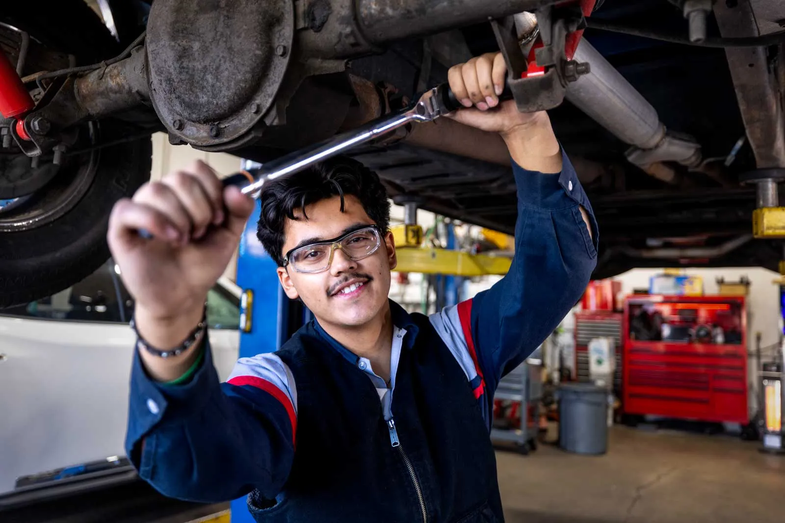 JP Estrada poses for a portrait in his families commercial garage. JP is one of several students who will be featured in the Universities "A Place For You" campaign.