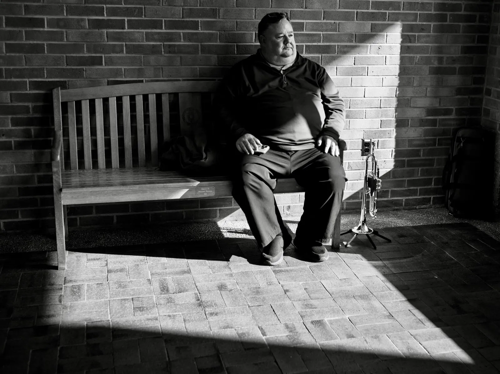 A trumpet player waits for his turn to play taps at the university's Veteran's Day service.