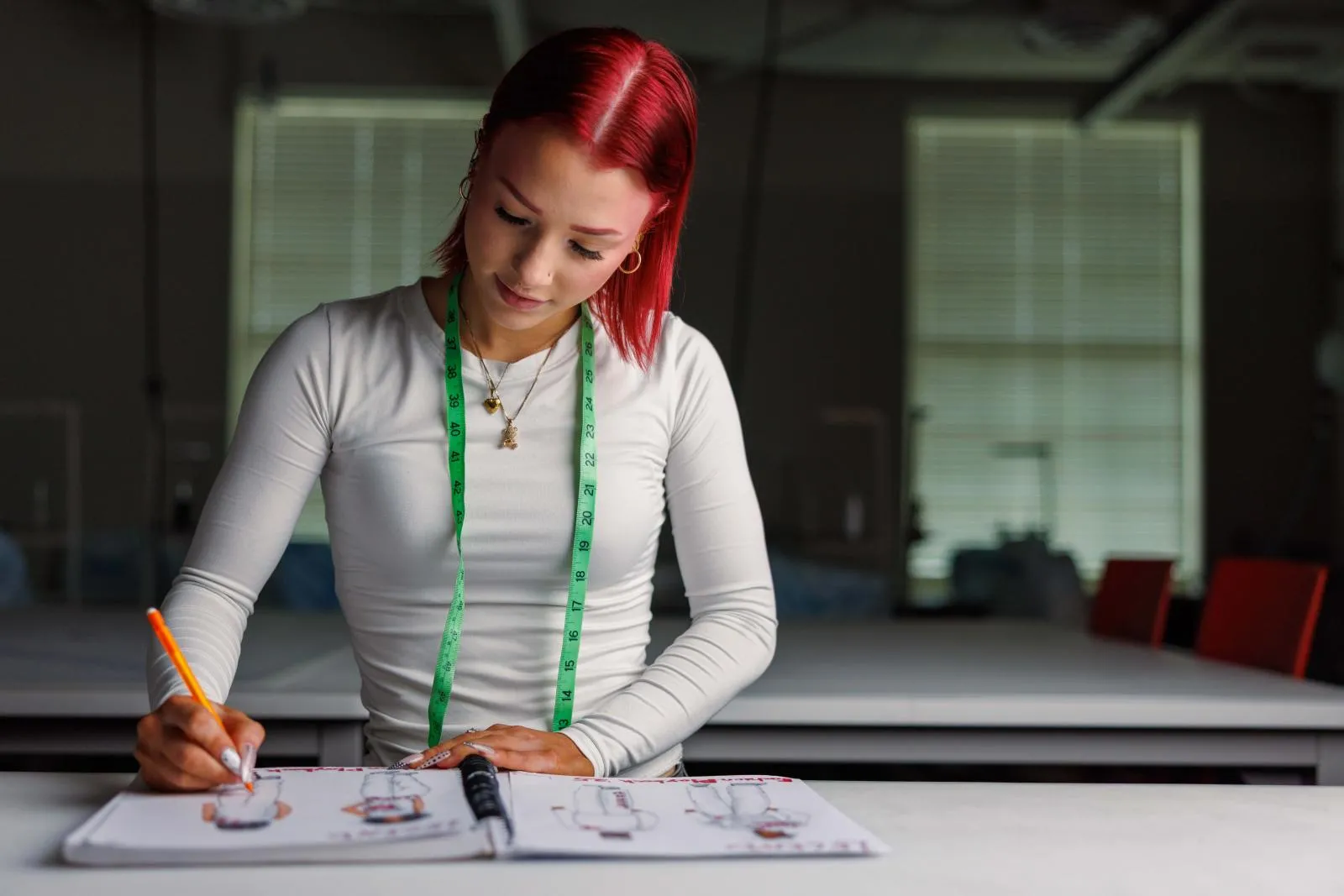 Aubry Davis is captured in the midst of creating her winning design for the tea time fashion show college-wide competition. Seated at her workspace, she carefully sketches her concept, part of the student-driven process where participants draw their own designs and later bring them to life in a full runway fashion show.
