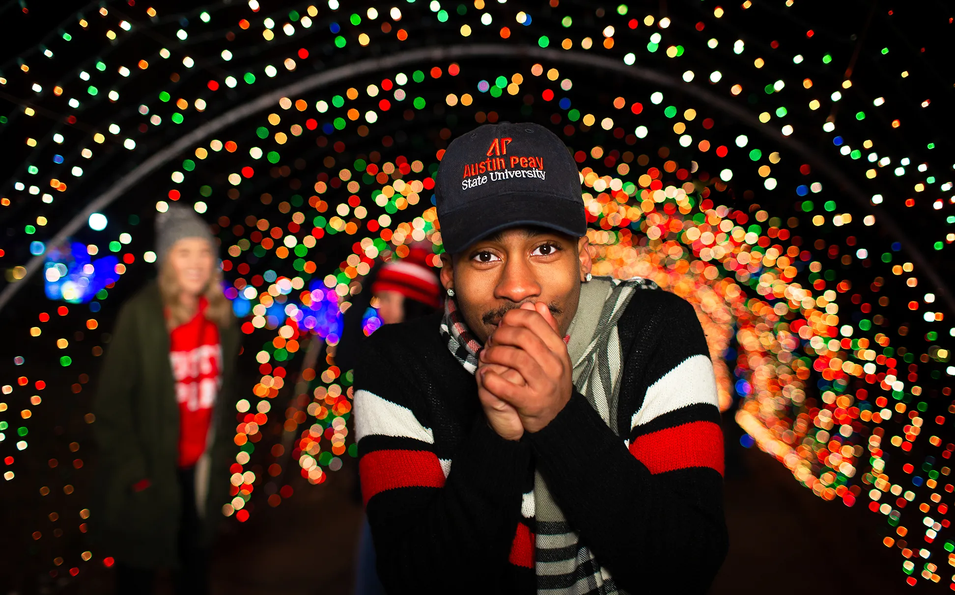 This photo was taken for the homepage image of the website (apsu.edu) to stay up over the holiday break. The student model was warming his hands up with is mouth and I captured it in between the posed smiles. The photo was lit with a large umbrella/Profoto in a tunnel of lights near campus.