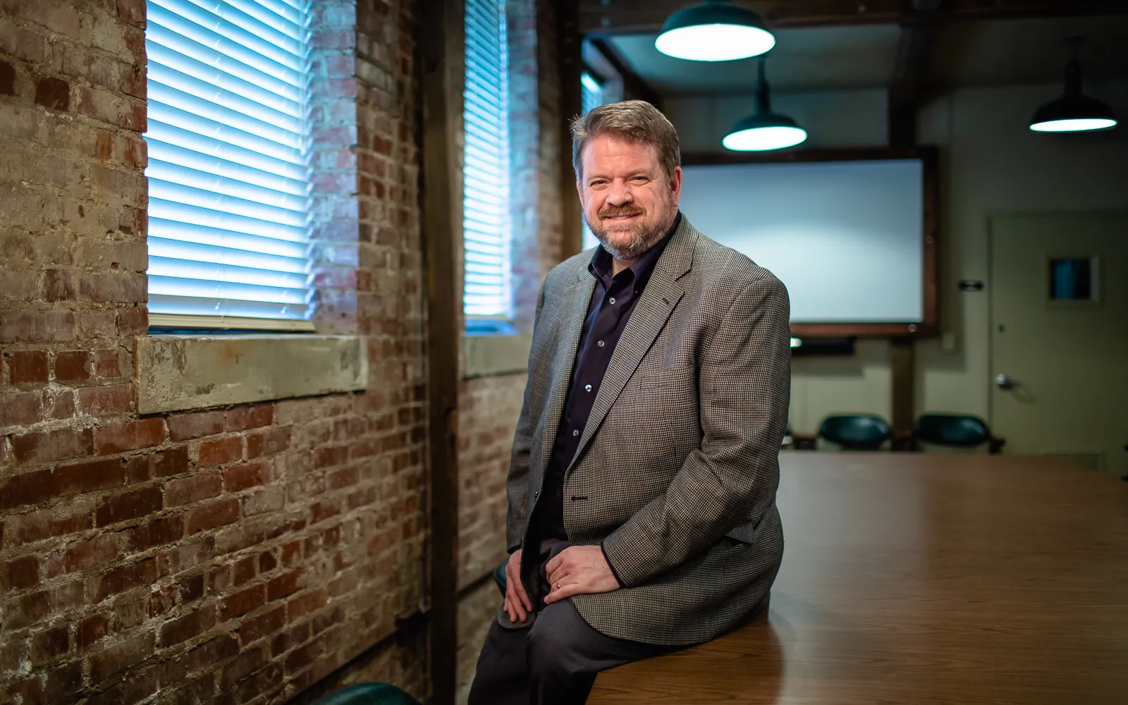 Dr. Daren Lawson, Dean of Fine Arts and Communication, poses for a portrait in the conference room of the concert, opera and drama building.