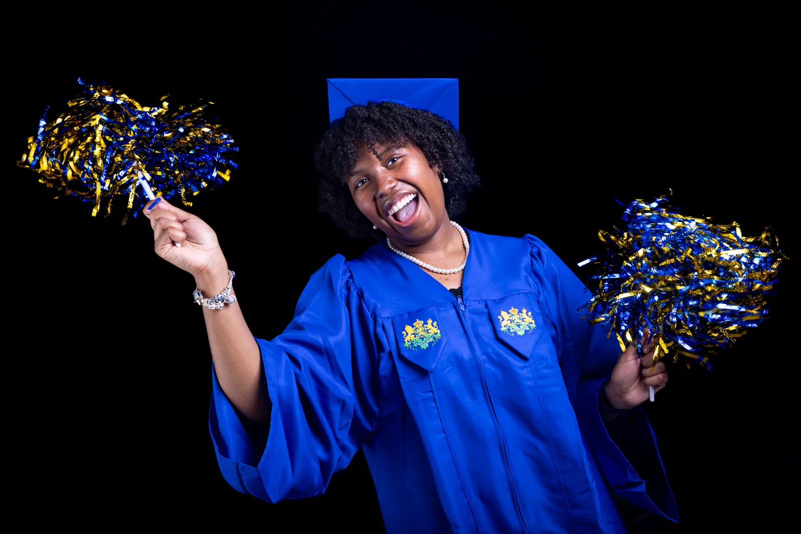 A graduating student shows their school spirit during the free graduation portrait session on May 13, 2025.