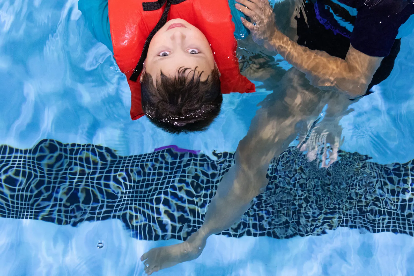 An education major gently moves a floating child during a CAPES! event after school hours. CAPES!, Children's Adaptive Physical Education Society, links special education students with special needs children in the community for monthly events.