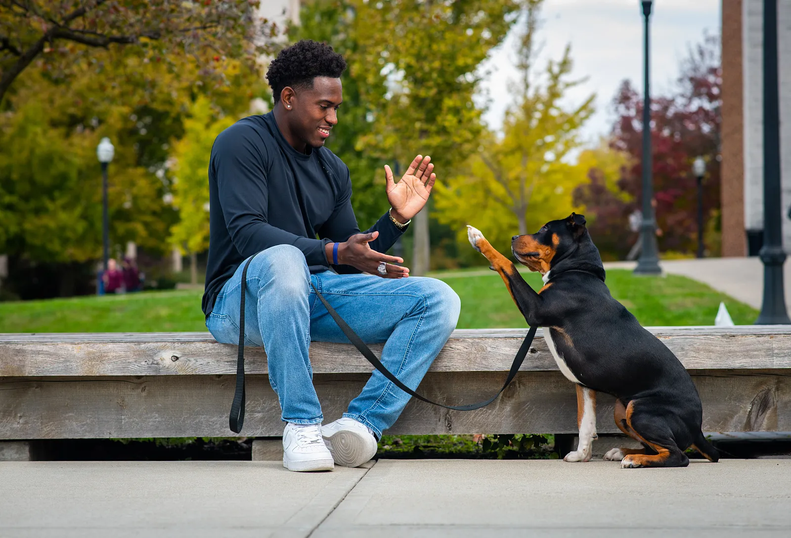 Indiana State University student Ellison Hanna enjoys the fall weather while teaching his puppy tricks near the fountain in Dede Plaza.