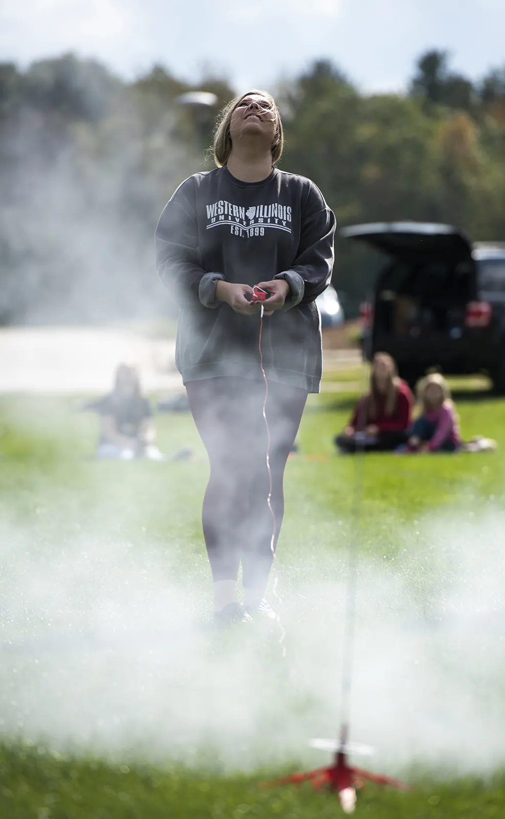 A science education 464 student looks up at her rocket in the air through a cloud of smoke during an outdoor exercise.