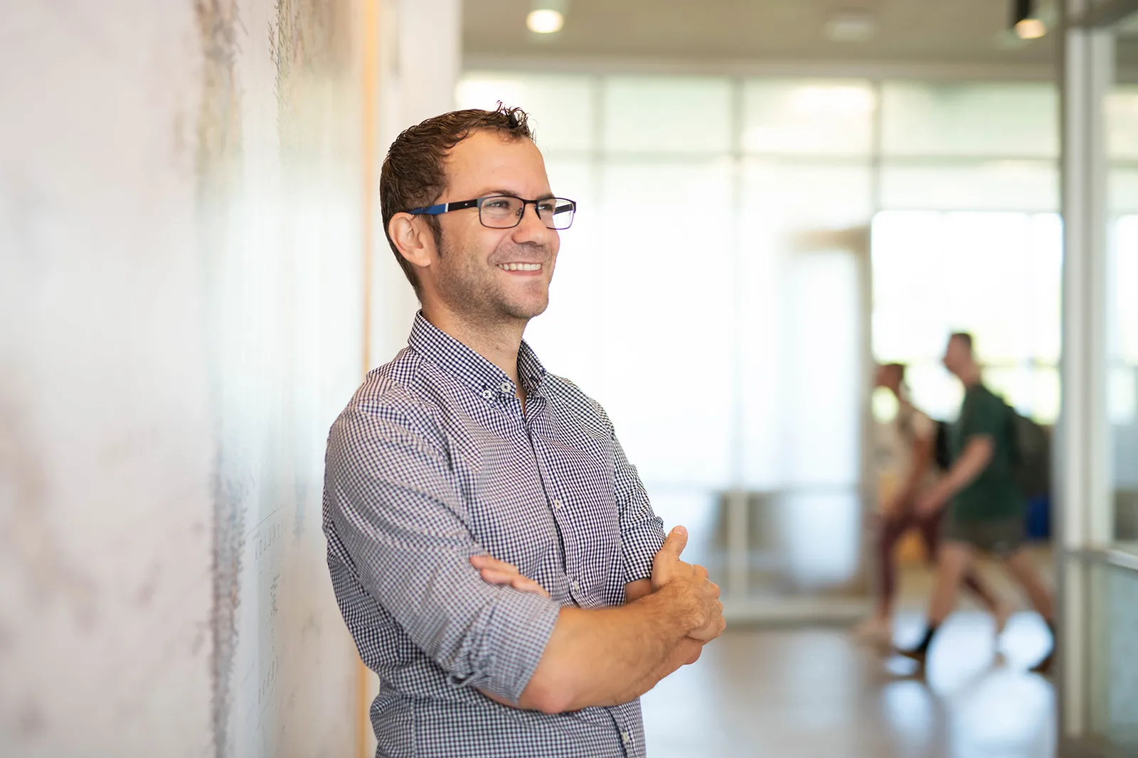 Foreign Language Professor Pac Martinez Ibarra poses for portrait in front of a world map.