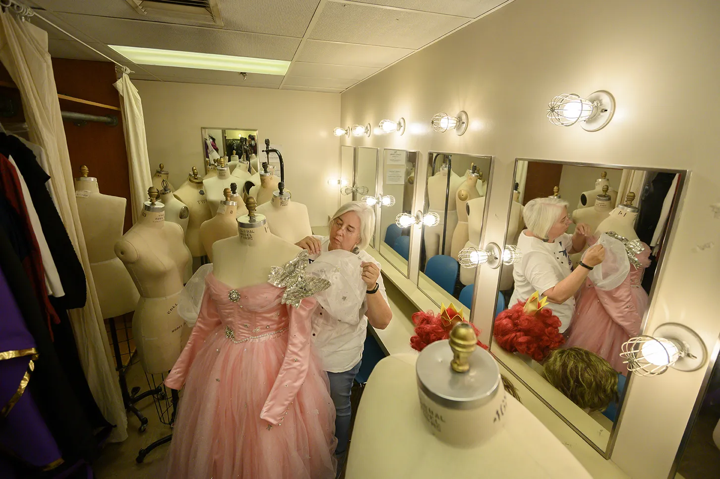 Roxanne Fleming, Production Supervisor for Theatre and Dance gets Glinda the Good Witch from the Wizard of Oz dress onto a dummy in the basement of Wright Hall. This costume will be auctioned off.