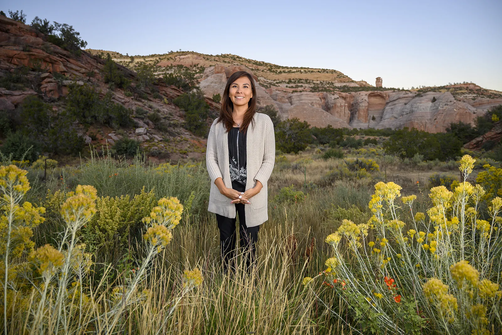 The principal of St Michael Indian School stands in a field near the Indian reservation in Window Rock, Arizona where she grew up.