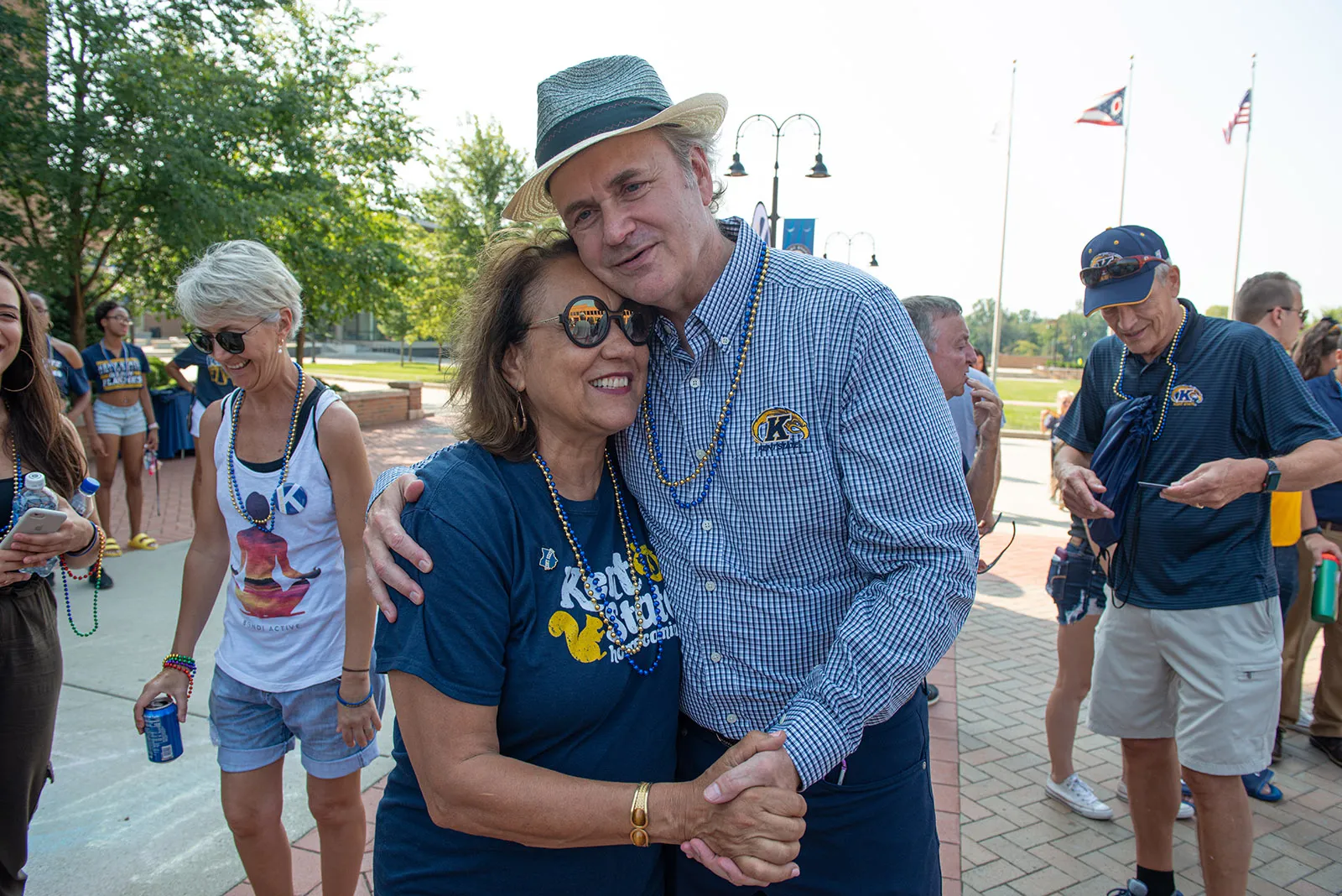 Kent State President Todd Diacon embraces his wife during the "Kiss on the K" event during homecoming.