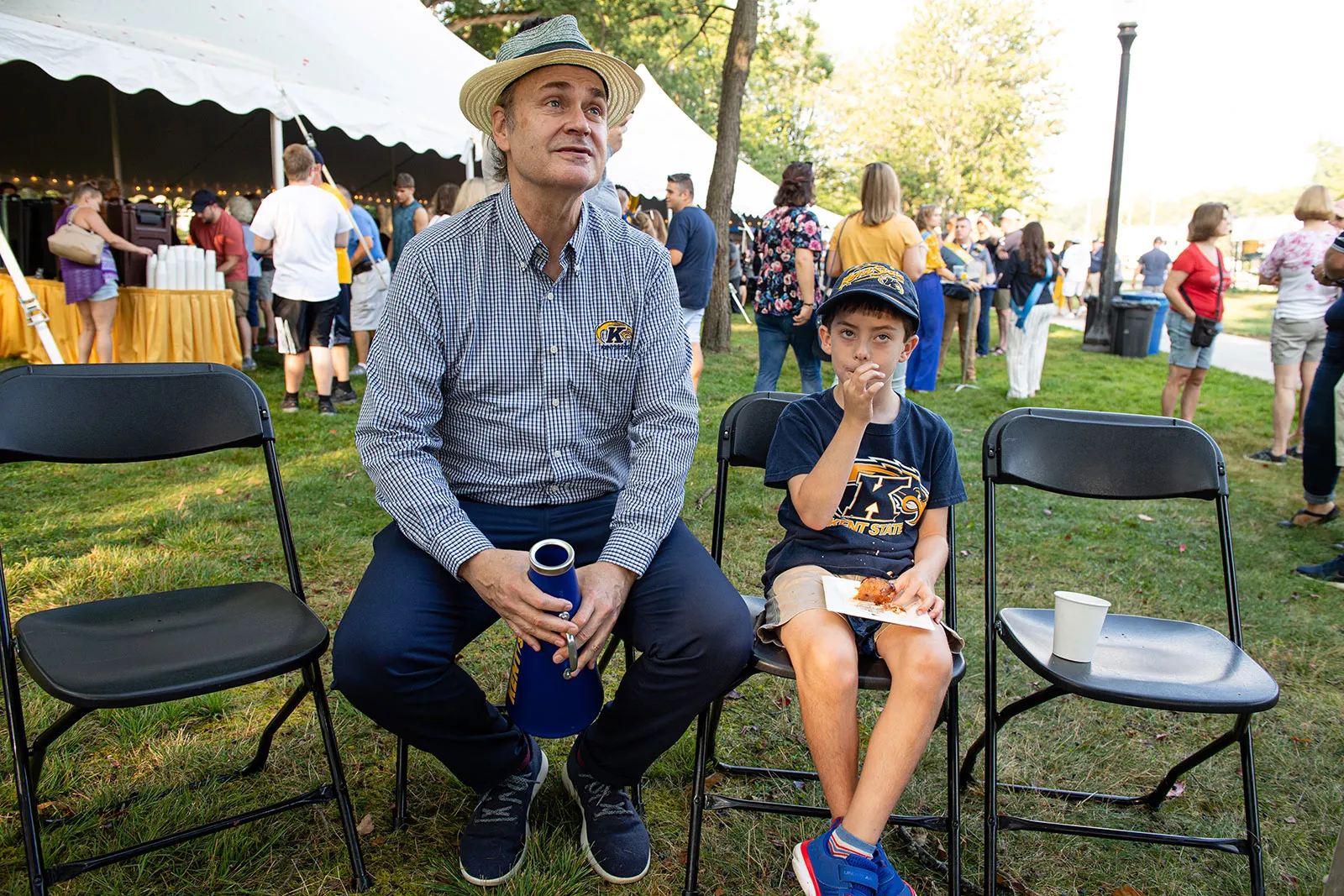 Kent State President Todd Diacon takes a little break with the son of a faculty member during homecoming