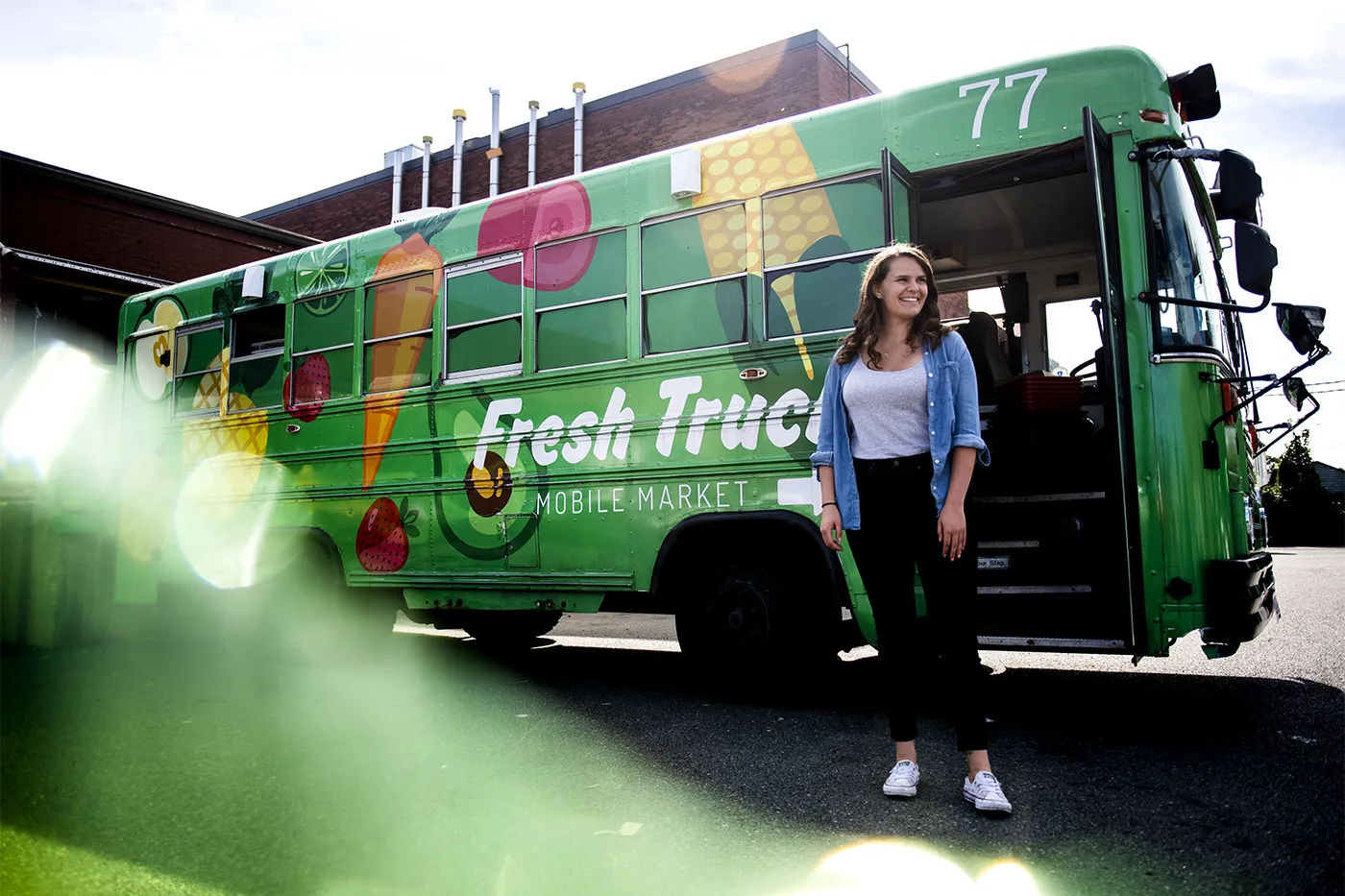 Alum Annika Morgan poses for a portrait in front of Fresh Truck, a mobile grocery store that brings affordable food closer to the people who need it the most.