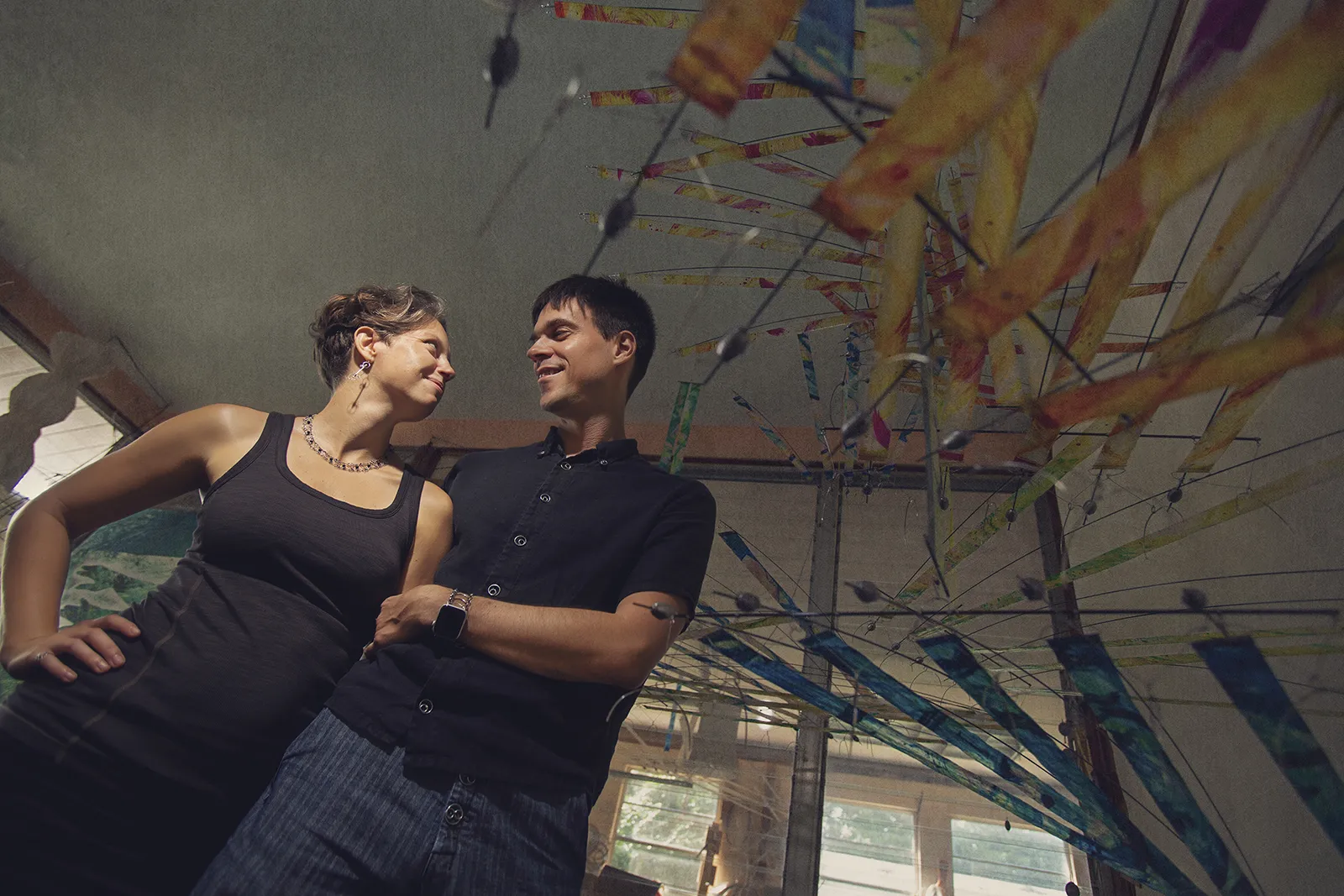 Tim Elverston and Ruth Whiting of WindFire Designs pose for a portrait alongside some of their work on mobiles inside their studio. The local artists' design mobiles that will be installed throughout the concourse of The Oaks.