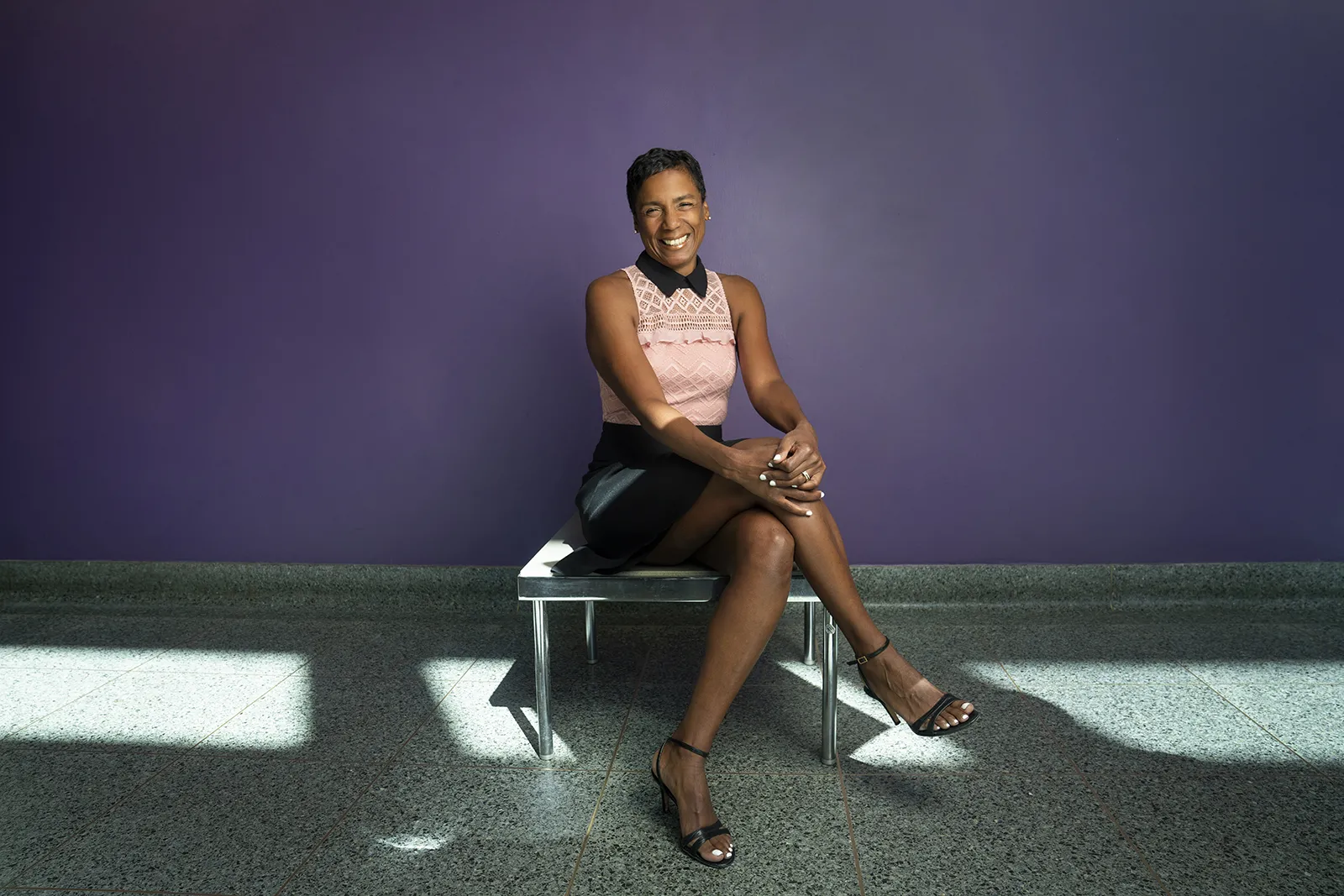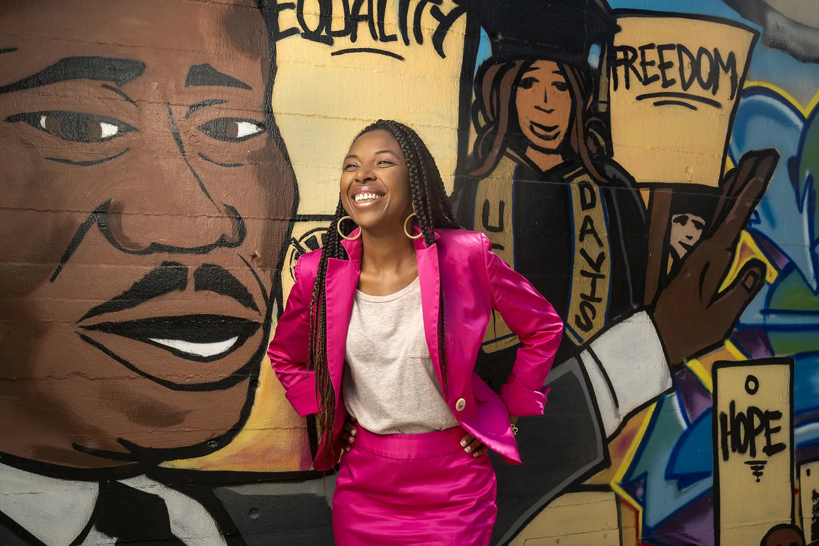 Jasmin Bush, Director of Brand Management and Marketing for Strategic Communications is photographed in front of a mural honoring Martin Luther King Jr. in the courtyard of King Hall on September 9, 2019.