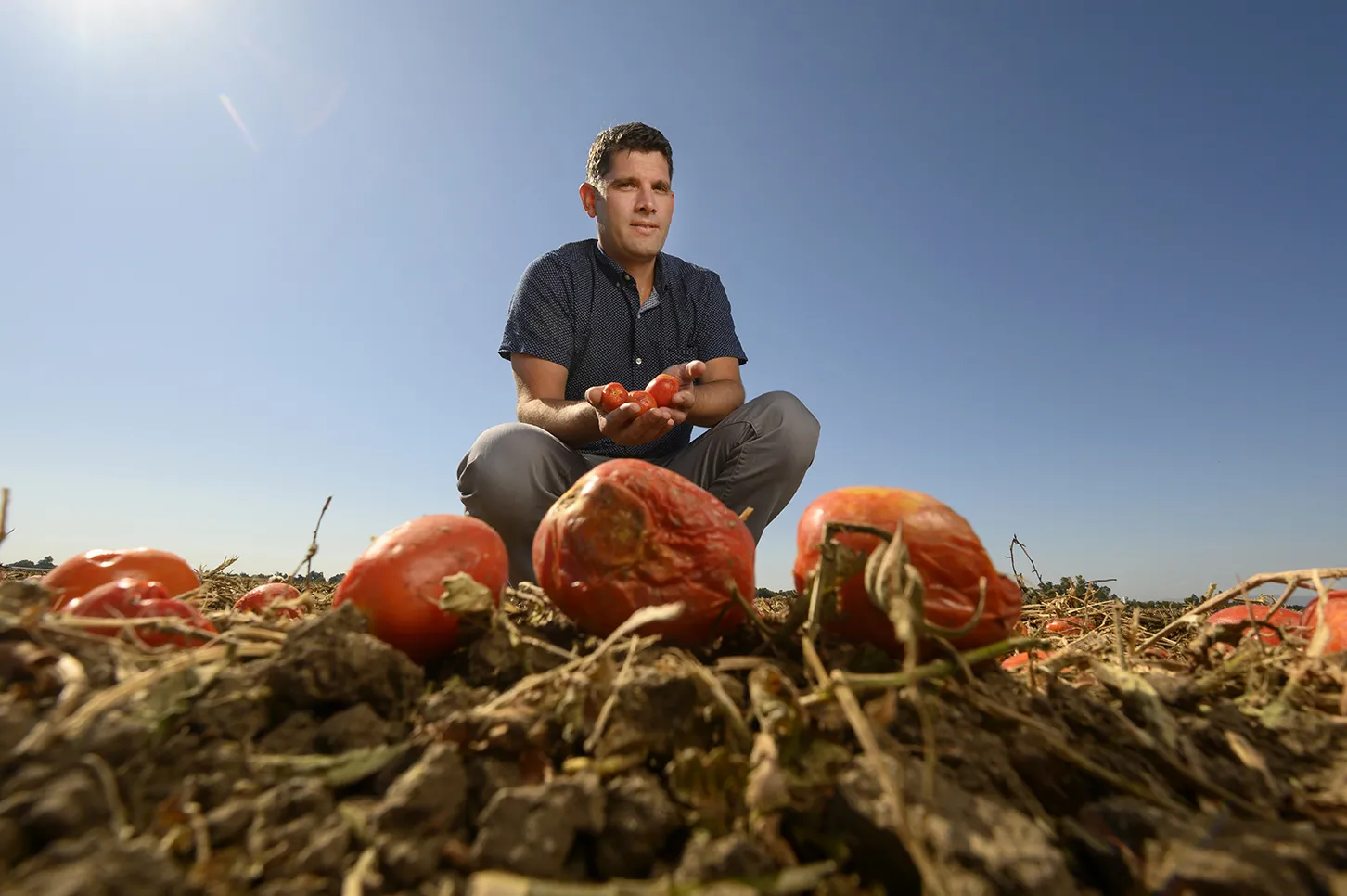 Assistant professor Edward Spang is in a field after harvest at Russell Ranch. His research is on food waste. His lab develops new food products and business models with surplus and co-products that currelty go to waste. Tomato fields that are mechanically harvested there is an expect one to two percent waste, which is a low waste level, while harvesting.