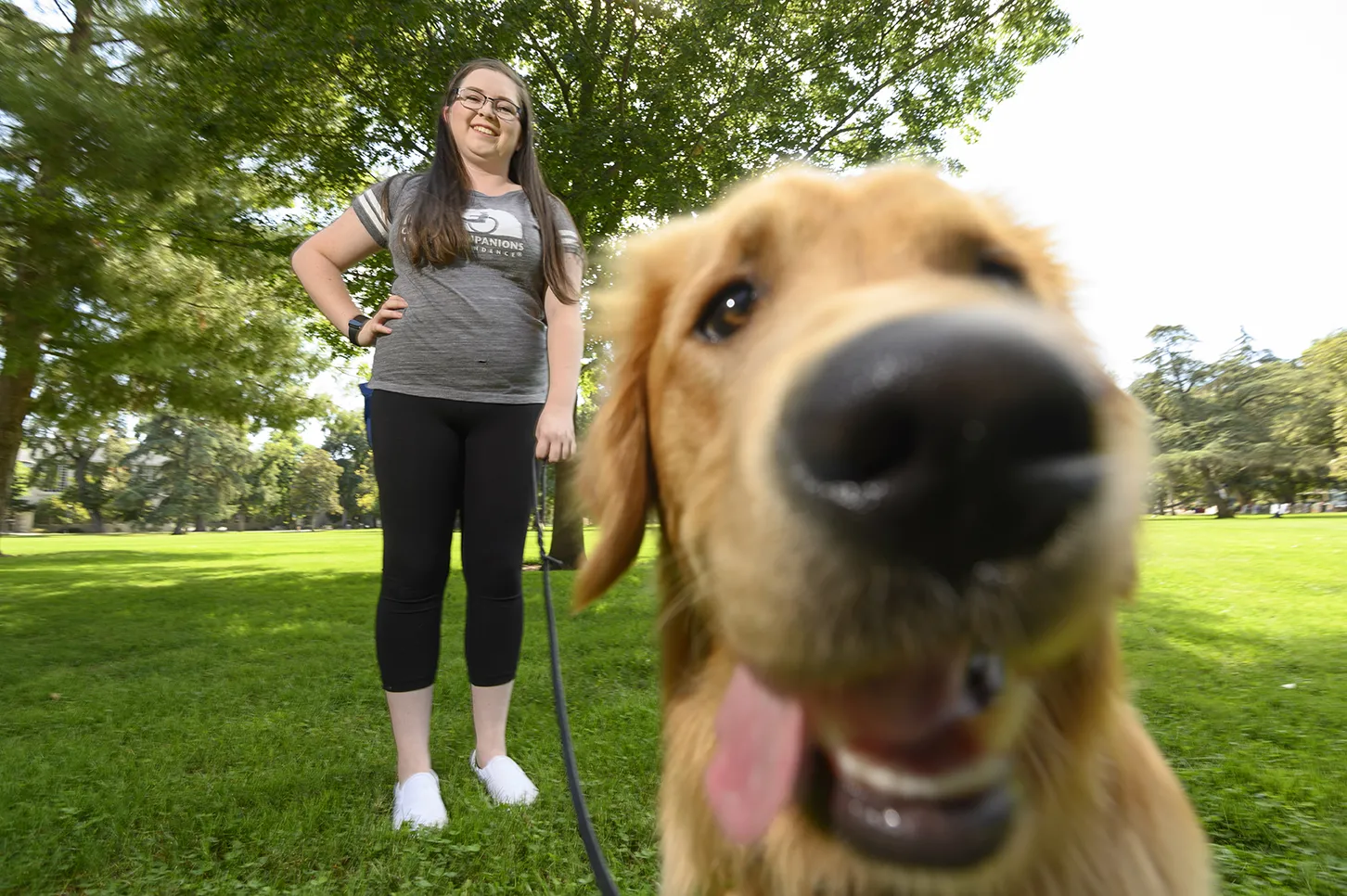 Elena O'Rourke stands with her student Fergus, a service in training, out on the Quad . Student Elena O'Rourke raises puppies for Puppy Pals, a student group that raises puppies to be service dogs.