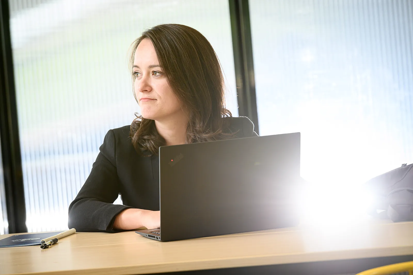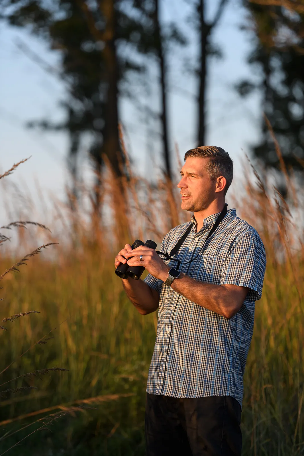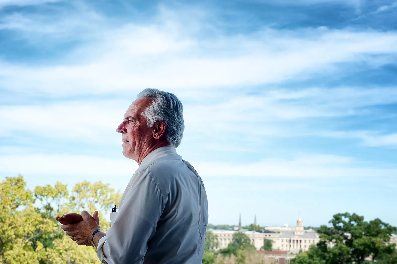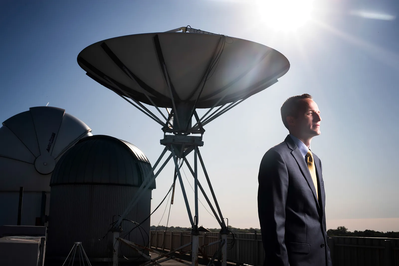 Portrait of Tippie College professor Daniel Newton atop Van Allen Hall. Newton has been commissioned by NASA to study task switching and the resulting mistakes that are made.