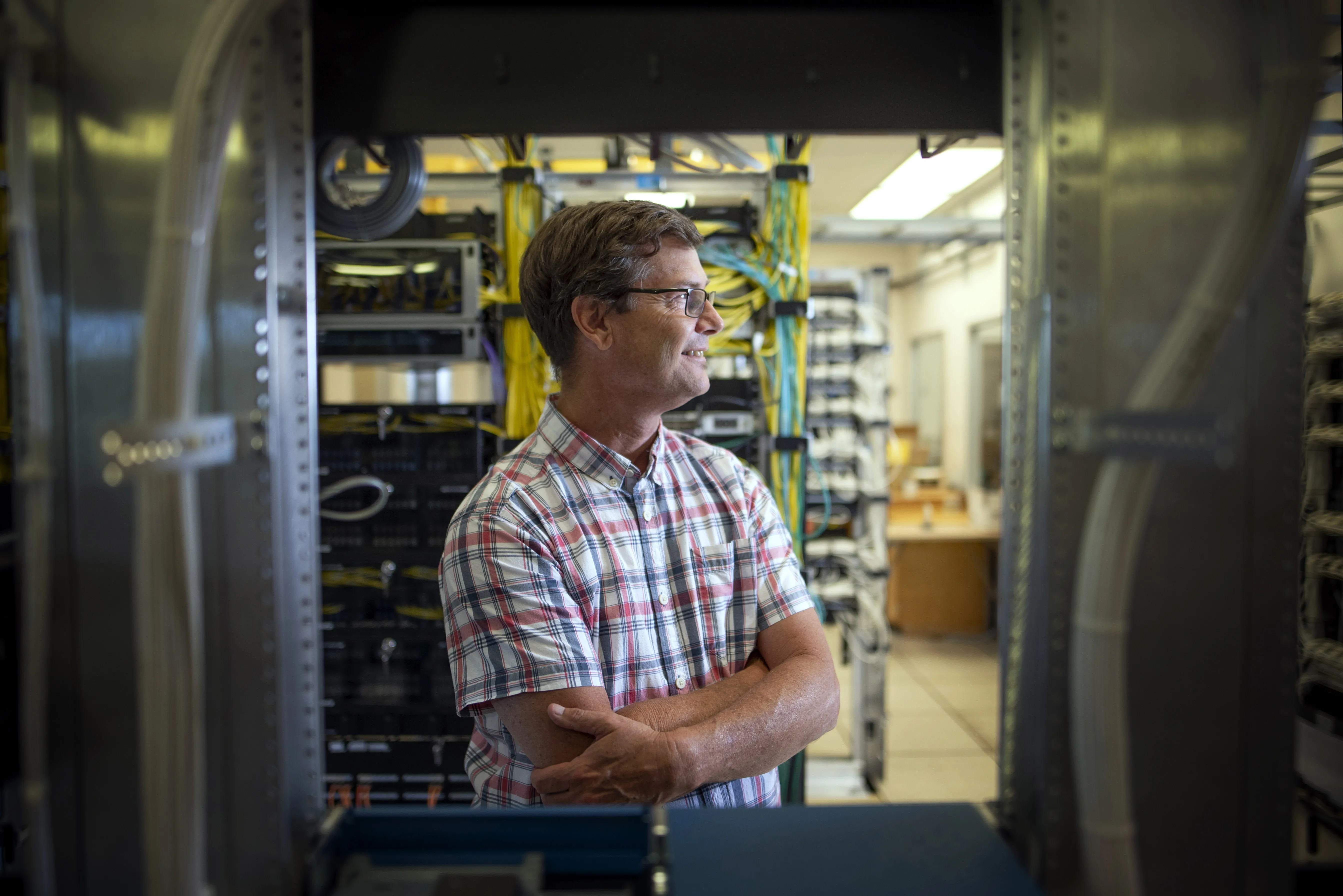 Scott Claverie, recent winner of the Emerging Campus Technology Leader award at the annual CSU Tech Conference, works in the Butte Hall datacenter on Thursday, August 15, 2019 in Chico, Calif.