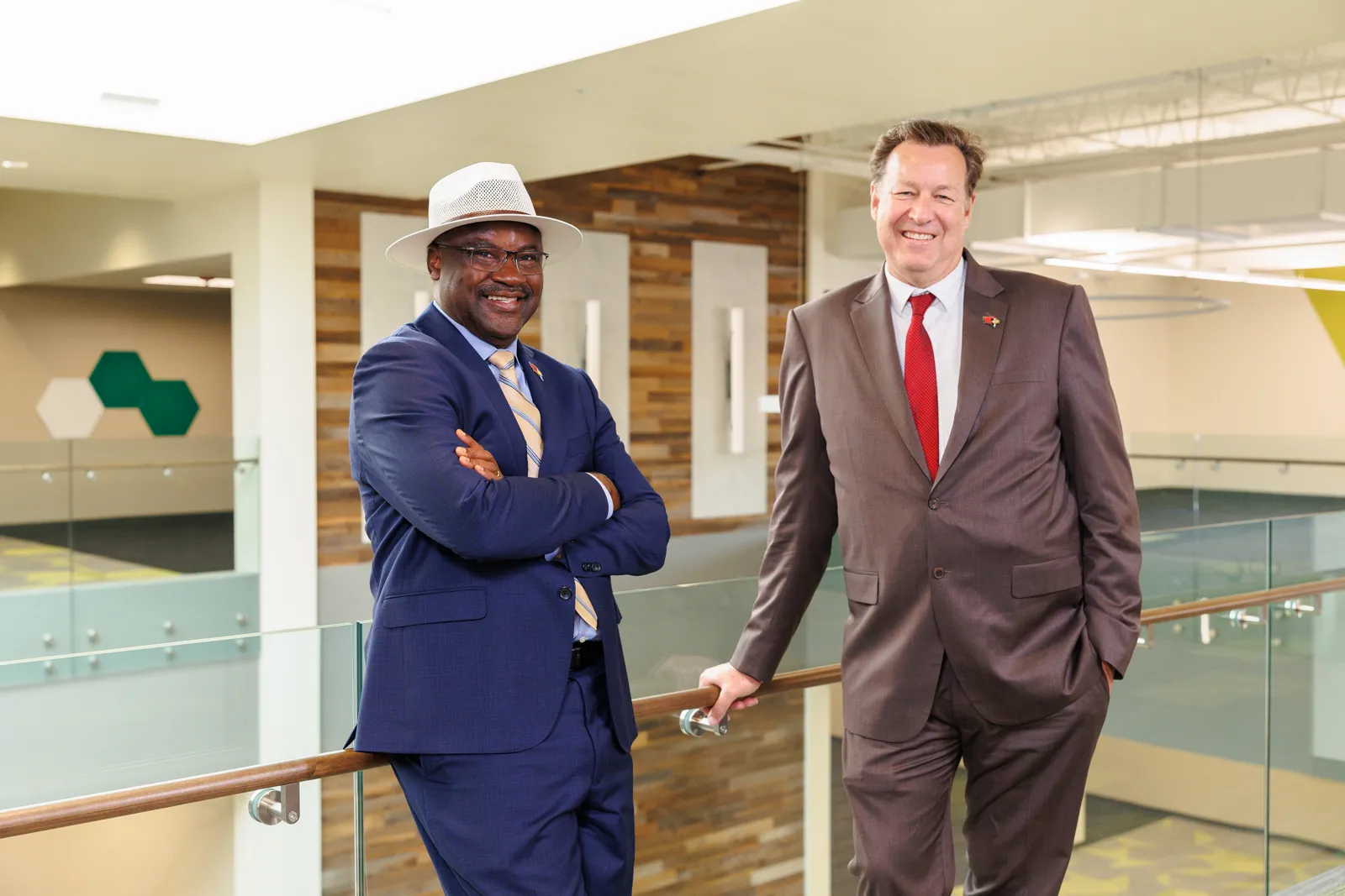 President Aondover Tarhule and the new dean of the College of Engineering pose for a photo in the newly acquired building that will house the first class of engineering students in the fall of 2025.