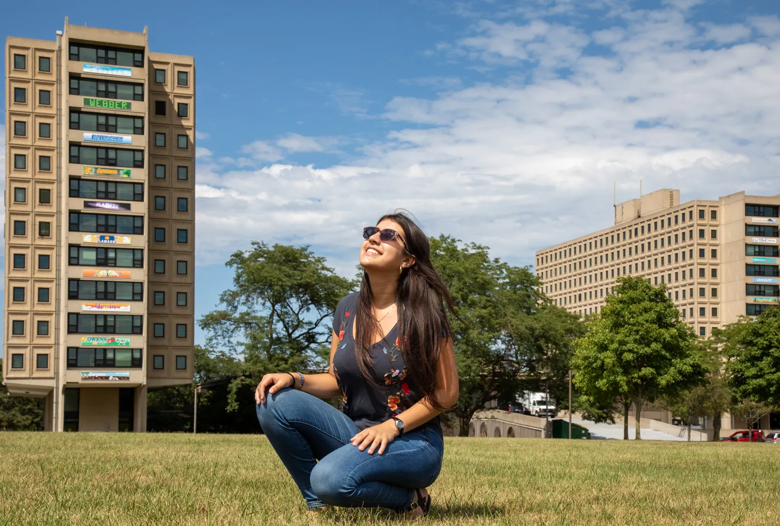 An International Business major poses near her residence hall for a student story - profile multimedia video.
