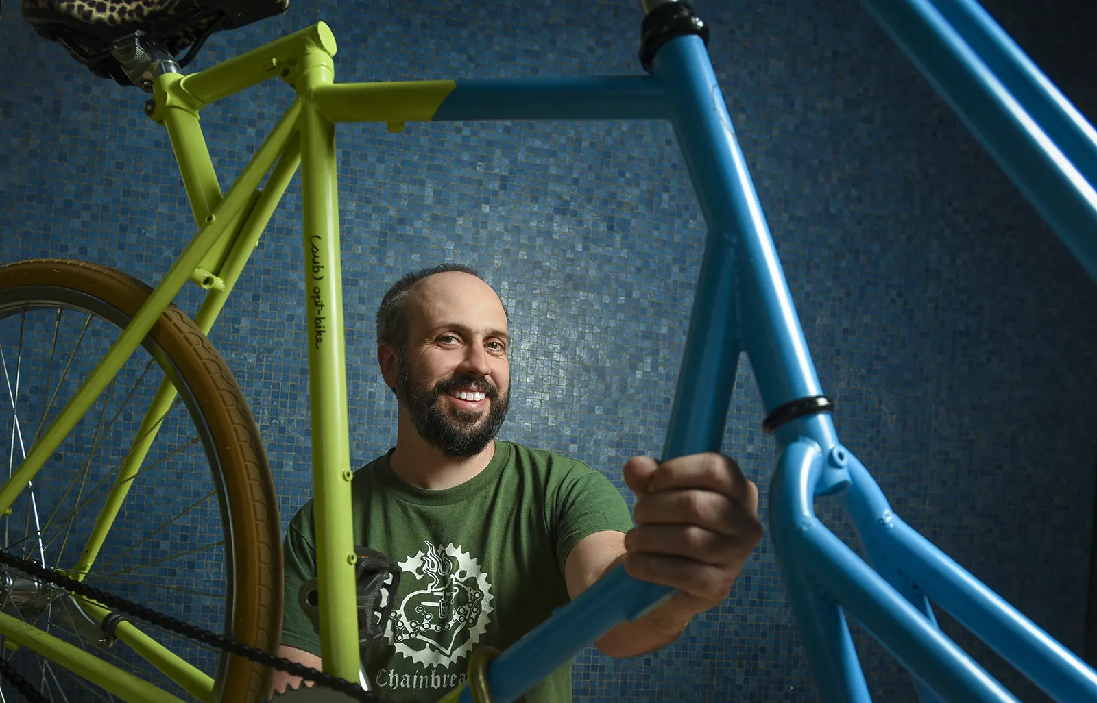 Jason Moore, Assistant Professor in the Department of Mechanical and Aerospace Engineering at UC Davis poses for a portrait with some of the bikes that he has created with his students.