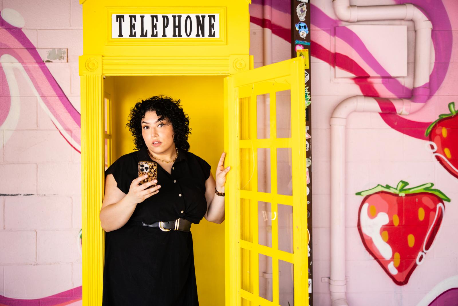 Fabiana Meléndez Ruiz holds her cell phonoe while standing in a telephone booth in Austin, Texas, on Oct. 30, 20224. Ruiz is transforming Austin’s PR scene with a bilingual, multicultural vision. In 2023, Ruiz received national recognition for exceptional contributions to the field when Ragan Communications and PR Daily named her a Rising Star (30 and under). In 2024, her agency, Refuerzo Collaborative, won the Austin Young Chamber FAVE Award for a young professional-led business and the Hispanic Public Relations Association National ¡BRAVO! Award for nonprofit campaign of the year.