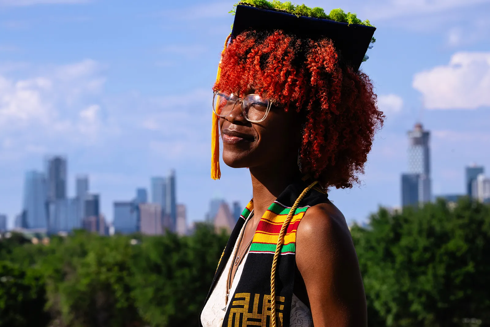 A graduate stands for a portrait after Legacy Walk with the downtown Austin skyline in the background.