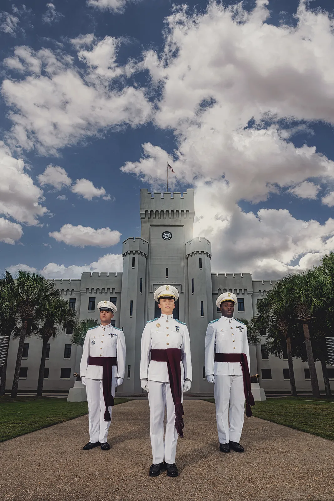 The South Carolina Corps of Cadets are lead by Regimental Commander Sara Zorn, center, Regimental Executive Officer David Days, right, and Elijah Melendez, Regimental Sargent Major. Zorn, is the first female Regimental Commander in history at The Citadel.